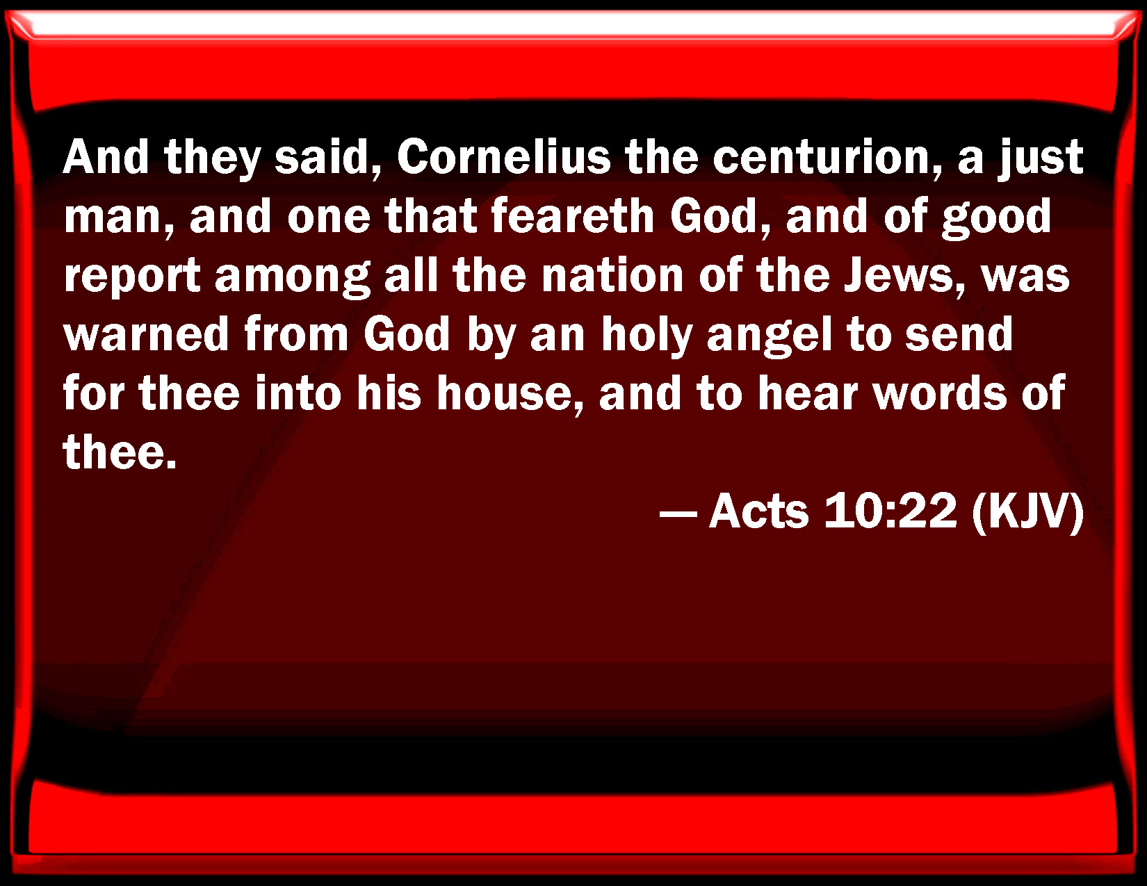Bible Verse Slide Acts 10:22 And they said, Cornelius the centurion, a just man, and one that fears God, and of good report among all the nation of the Jews, was warned from God by an holy angel to send for you into his house, and to hear words of you. KJV: And they said, Cornelius the centurion, a just man, and one that feareth God, and of good report among all the nation of the Jews, was warned from God by an holy angel to send for thee into his house, and to hear words of thee. DRB: Who said: Cornelius, a centurion, a just man, and one that feareth God, and having good testimony from all the nation of the Jews, received an answer of an holy angel, to send for thee into his house, and to hear words of thee. DBT: And they said, Cornelius, a centurion, a righteous man, and fearing God, and borne witness to by the whole nation of the Jews, has been divinely instructed by a holy angel to send for thee to his house, and hear words from thee. ERV: And they said, Cornelius a centurion, a righteous man and one that feareth God, and well reported of by all the nation of the Jews, was warned of God by a holy angel to send for thee into his house, and to hear words from thee. WBT: And they said, Cornelius the centurion, a just man, and one that feareth God, and of good report among all the nation of the Jews, was warned from God by a holy angel to send for thee into his house, and to hear words from thee. WEB: They said, "Cornelius, a centurion, a righteous man and one who fears God, and well spoken of by all the nation of the Jews, was directed by a holy angel to invite you to his house, and to listen to what you say." YLT: And they said, 'Cornelius, a centurion, a man righteous and fearing God, well testified to, also, by all the nation of the Jews, was divinely warned by a holy messenger to send for thee, to his house, and to hear sayings from thee.'Links Acts 10:22 NIV • Acts 10:22 NLT • Acts 10:22 ESV • Acts 10:22 NASB • Acts 10:22 KJV • Acts 10:22 Interlinear • Acts 10:22 Commentaries • Acts 10:22 Parallel Texts • Acts 10:22 Bible Apps • Acts 10:22 Parallel • Bible Hub |