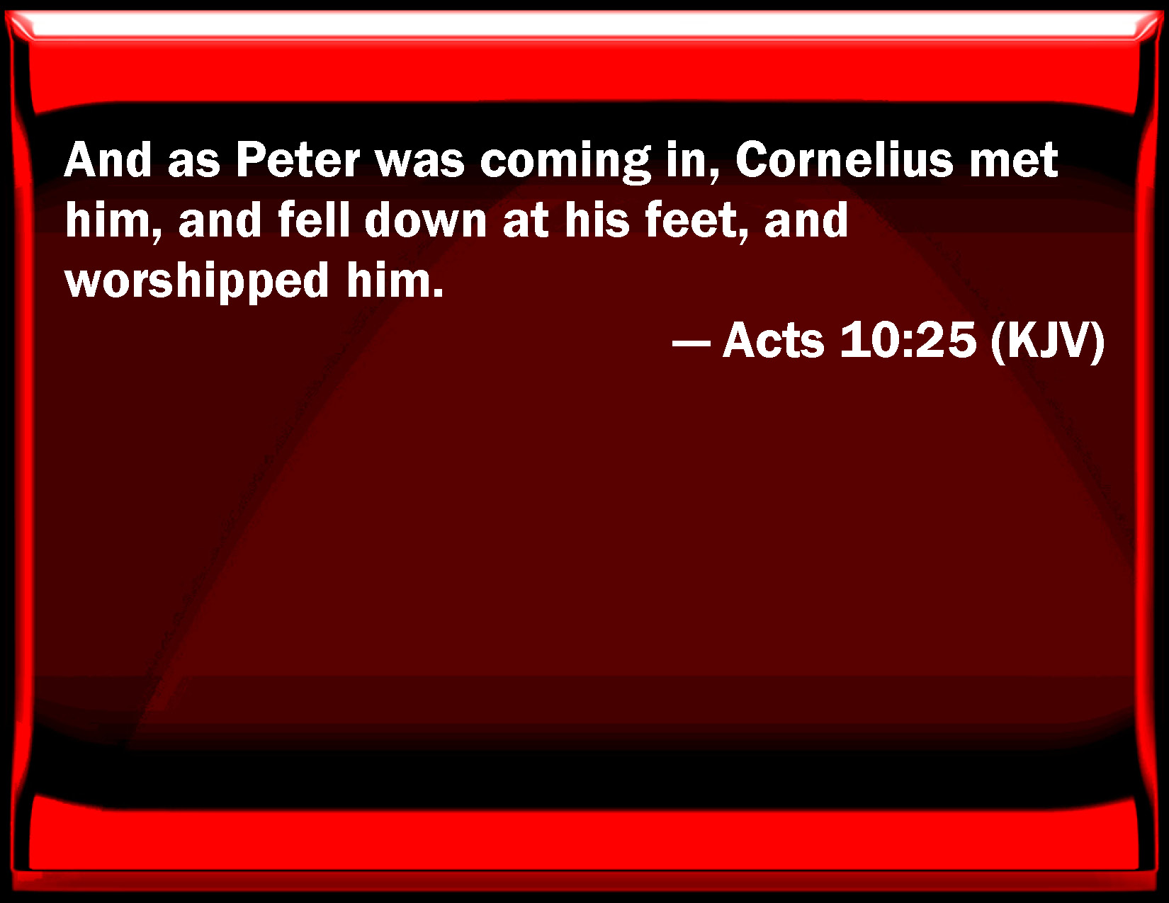 Bible Verse Slide Acts 10:25 And as Peter was coming in, Cornelius met him, and fell down at his feet, and worshipped him. KJV: And as Peter was coming in, Cornelius met him, and fell down at his feet, and worshipped him. DRB: And it came to pass, that when Peter was come in, Cornelius came to meet him, Cornelius came to meet him, and falling at his feet adored. DBT: And when Peter was now coming in, Cornelius met him, and falling down did him homage. ERV: And when it came to pass that Peter entered, Cornelius met him, and fell down at his feet, and worshipped him. WBT: And as Peter was coming in, Cornelius met him, and fell down at his feet, and worshiped him. WEB: When it happened that Peter entered, Cornelius met him, fell down at his feet, and worshiped him. YLT: and as it came that Peter entered in, Cornelius having met him, having fallen at his feet, did bow before him;Links Acts 10:25 NIV • Acts 10:25 NLT • Acts 10:25 ESV • Acts 10:25 NASB • Acts 10:25 KJV • Acts 10:25 Interlinear • Acts 10:25 Commentaries • Acts 10:25 Parallel Texts • Acts 10:25 Bible Apps • Acts 10:25 Parallel • Bible Hub |
