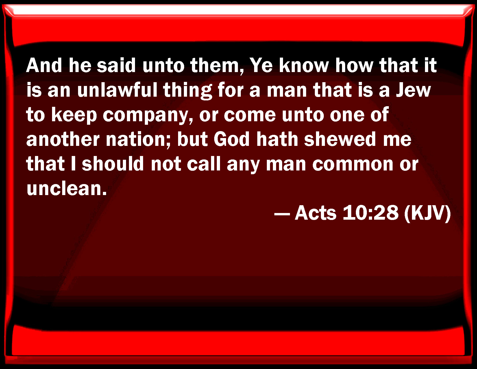 Bible Verse Slide Acts 10:28 And he said to them, You know how that it is an unlawful thing for a man that is a Jew to keep company, or come to one of another nation; but God has showed me that I should not call any man common or unclean. KJV: And he said unto them, Ye know how that it is an unlawful thing for a man that is a Jew to keep company, or come unto one of another nation; but God hath shewed me that I should not call any man common or unclean. DRB: And he said to them: You know how abominable it is for a man that is a Jew, to keep company or to come unto one of another nation: but God hath shewed to me, to call no man common or unclean. DBT: And he said to them, Ye know how it is unlawful for a Jew to be joined or come to one of a strange race, and to me God has shewn to call no man common or unclean. ERV: and he said unto them, Ye yourselves know how that it is an unlawful thing for a man that is a Jew to join himself or come unto one of another nation; and yet unto me hath God shewed that I should not call any man common or unclean: WBT: And he said to them, Ye know that it is an unlawful thing for a man that is a Jew to keep company, or come to one of another nation; but God hath shown me that I should not call any man common or unclean. WEB: He said to them, "You yourselves know how it is an unlawful thing for a man who is a Jew to join himself or come to one of another nation, but God has shown me that I shouldn't call any man unholy or unclean. YLT: And he said unto them, 'Ye know how it is unlawful for a man, a Jew, to keep company with, or to come unto, one of another race, but to me God did shew to call no man common or unclean;Links Acts 10:28 NIV • Acts 10:28 NLT • Acts 10:28 ESV • Acts 10:28 NASB • Acts 10:28 KJV • Acts 10:28 Interlinear • Acts 10:28 Commentaries • Acts 10:28 Parallel Texts • Acts 10:28 Bible Apps • Acts 10:28 Parallel • Bible Hub |