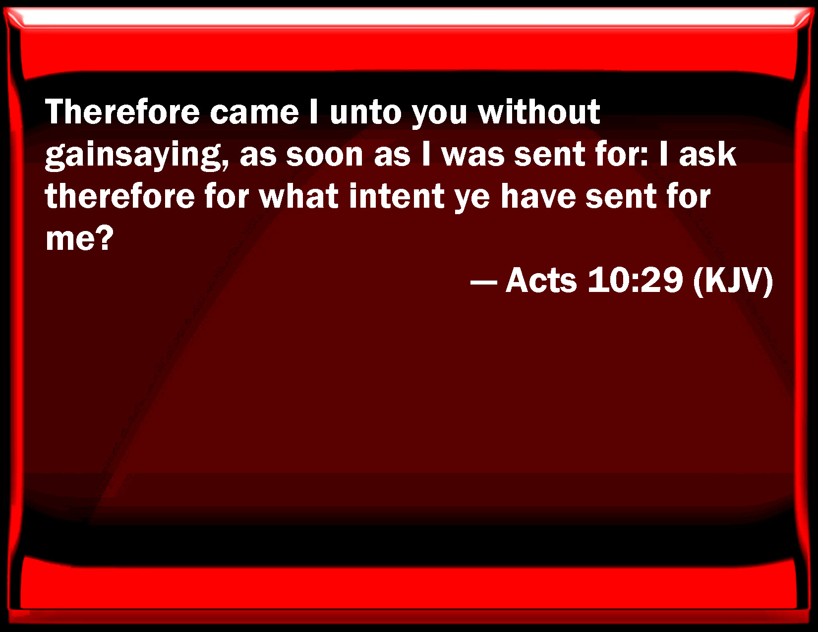 Bible Verse Slide Acts 10:29 Therefore came I to you without gainsaying, as soon as I was sent for: I ask therefore for what intent you have sent for me? KJV: Therefore came I unto you without gainsaying, as soon as I was sent for: I ask therefore for what intent ye have sent for me? DRB: For which cause, making no doubt, I came when I was sent for. I ask, therefore, for what cause you have sent for me? DBT: Wherefore also, having been sent for, I came without saying anything against it. I inquire therefore for what reason ye have sent for me. ERV: wherefore also I came without gainsaying, when I was sent for. I ask therefore with what intent ye sent for me. WBT: Therefore I came to you without gainsaying, as soon as I was sent for: I ask therefore for what intent ye have sent for me? WEB: Therefore also I came without complaint when I was sent for. I ask therefore, why did you send for me?" YLT: therefore also without gainsaying I came, having been sent for; I ask, therefore, for what matter ye did send for me?'Links Acts 10:29 NIV • Acts 10:29 NLT • Acts 10:29 ESV • Acts 10:29 NASB • Acts 10:29 KJV • Acts 10:29 Interlinear • Acts 10:29 Commentaries • Acts 10:29 Parallel Texts • Acts 10:29 Bible Apps • Acts 10:29 Parallel • Bible Hub |