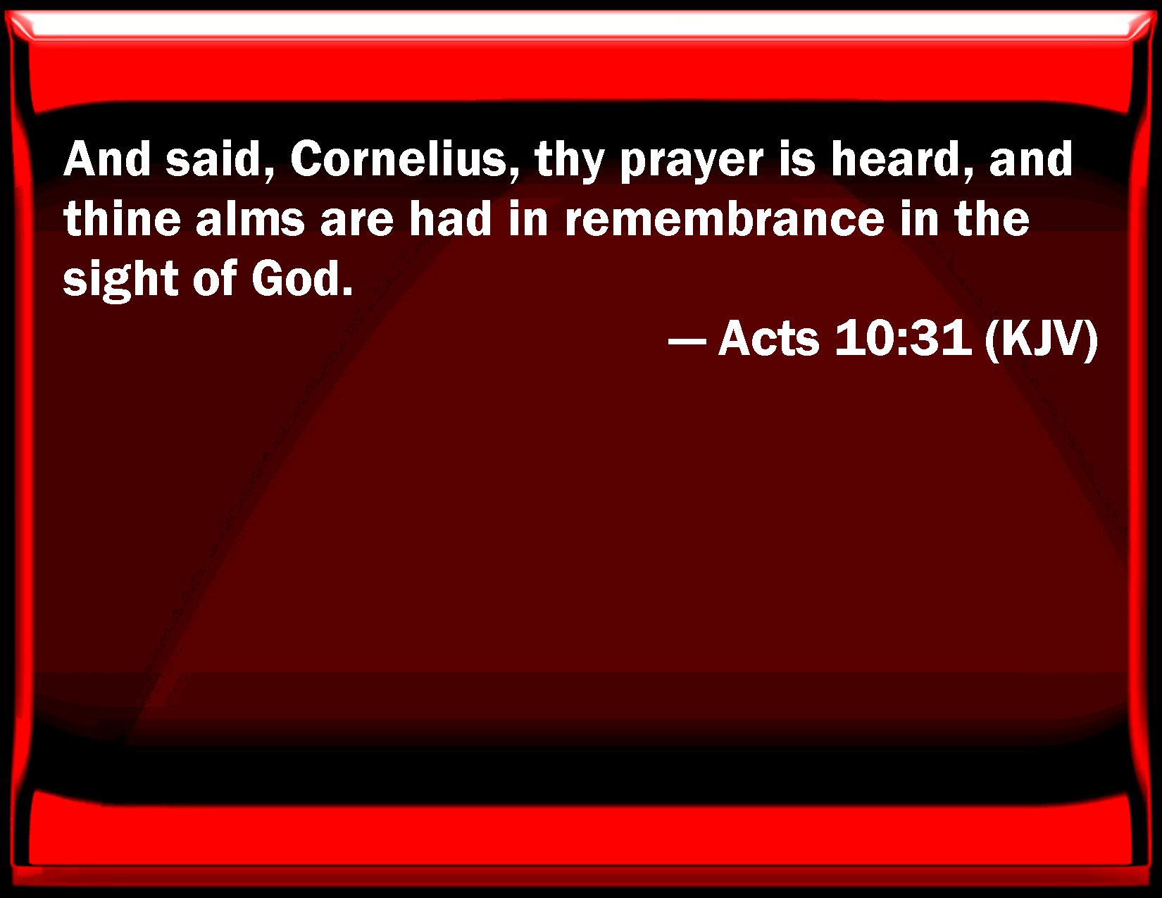 Bible Verse Slide Acts 10:31 And said, Cornelius, your prayer is heard, and your alms are had in remembrance in the sight of God. KJV: And said, Cornelius, thy prayer is heard, and thine alms are had in remembrance in the sight of God. DRB: Cornelius, thy prayer is heard, and thy alms are had in remembrance in the sight of God. DBT: and said, Cornelius, thy prayer has been heard, and thy alms have come in remembrance before God. ERV: and saith, Cornelius, thy prayer is heard, and thine alms are had in remembrance in the sight of God. WBT: And said, Cornelius, thy prayer is heard, and thy alms are had in remembrance in the sight of God. WEB: and said, 'Cornelius, your prayer is heard, and your gifts to the needy are remembered in the sight of God. YLT: and he said, Cornelius, thy prayer was heard, and thy kind acts were remembered before God;Links Acts 10:31 NIV • Acts 10:31 NLT • Acts 10:31 ESV • Acts 10:31 NASB • Acts 10:31 KJV • Acts 10:31 Interlinear • Acts 10:31 Commentaries • Acts 10:31 Parallel Texts • Acts 10:31 Bible Apps • Acts 10:31 Parallel • Bible Hub |