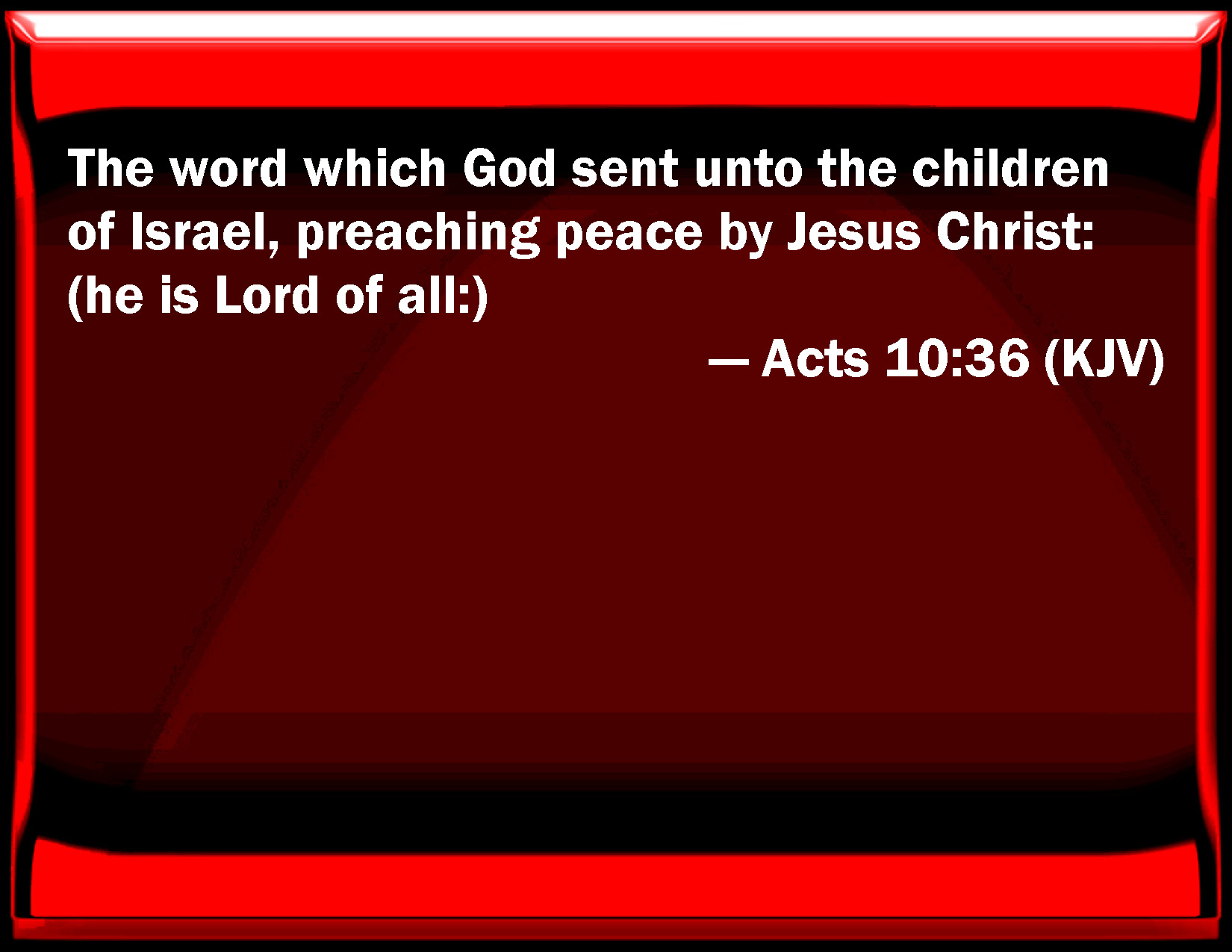 Bible Verse Slide Acts 10:36 The word which God sent to the children of Israel, preaching peace by Jesus Christ: (he is Lord of all:) KJV: The word which God sent unto the children of Israel, preaching peace by Jesus Christ: (he is Lord of all:) DRB: God sent the word to the children of Israel, preaching peace by Jesus Christ: (he is Lord of all.) DBT: The word which he sent to the sons of Israel, preaching peace by Jesus Christ, (he is Lord of all things,) ERV: The word which he sent unto the children of Israel, preaching good tidings of peace by Jesus Christ (he is Lord of all)— WBT: The word which God sent to the children of Israel, preaching peace by Jesus Christ: (he is Lord of all:) WEB: The word which he sent to the children of Israel, preaching good news of peace by Jesus Christ—he is Lord of all— YLT: the word that he sent to the sons of Israel, proclaiming good news — peace through Jesus Christ (this one is Lord of all,)Links Acts 10:36 NIV • Acts 10:36 NLT • Acts 10:36 ESV • Acts 10:36 NASB • Acts 10:36 KJV • Acts 10:36 Interlinear • Acts 10:36 Commentaries • Acts 10:36 Parallel Texts • Acts 10:36 Bible Apps • Acts 10:36 Parallel • Bible Hub |
