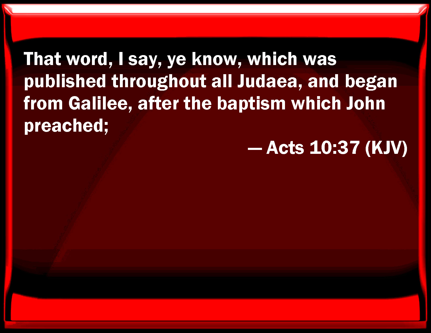 Bible Verse Slide Acts 10:37 That word, I say, you know, which was published throughout all Judaea, and began from Galilee, after the baptism which John preached; KJV: That word, I say, ye know, which was published throughout all Judaea, and began from Galilee, after the baptism which John preached; DRB: You know the word which hath been published through all Judea: for it began from Galilee, after the baptism which John preached, DBT: ye know; the testimony which has spread through the whole of Judaea, beginning from Galilee after the baptism which John preached — ERV: that saying ye yourselves know, which was published throughout all Judaea, beginning from Galilee, after the baptism which John preached; WBT: That word, I say, ye know, which was published throughout all Judea, and began from Galilee, after the baptism which John preached; WEB: you yourselves know what happened, which was proclaimed throughout all Judea, beginning from Galilee, after the baptism which John preached; YLT: ye — ye have known; — the word that came throughout all Judea, having begun from Galilee, after the baptism that John preached;Links Acts 10:37 NIV • Acts 10:37 NLT • Acts 10:37 ESV • Acts 10:37 NASB • Acts 10:37 KJV • Acts 10:37 Interlinear • Acts 10:37 Commentaries • Acts 10:37 Parallel Texts • Acts 10:37 Bible Apps • Acts 10:37 Parallel • Bible Hub |