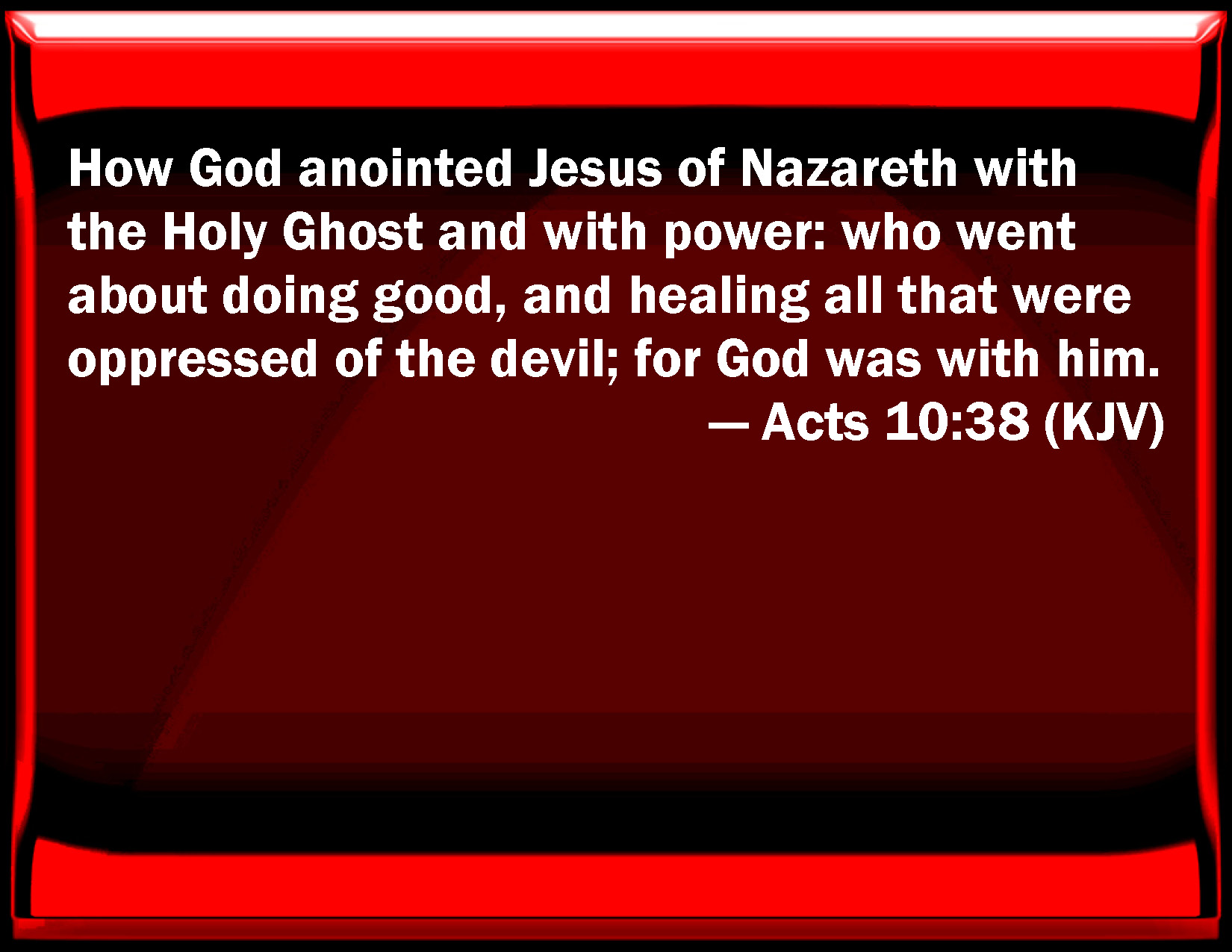 Bible Verse Slide Acts 10:38 How God anointed Jesus of Nazareth with the Holy Ghost and with power: who went about doing good, and healing all that were oppressed of the devil; for God was with him. KJV: How God anointed Jesus of Nazareth with the Holy Ghost and with power: who went about doing good, and healing all that were oppressed of the devil; for God was with him. DRB: Jesus of Nazareth: how God anointed him with the Holy Ghost, and with power, who went about doing good, and healing all that were oppressed by the devil, for God was with him. DBT: Jesus who was of Nazareth: how God anointed him with the Holy Spirit and with power; who went through all quarters doing good, and healing all that were under the power of the devil, because God was with him. ERV: even Jesus of Nazareth, how that God anointed him with the Holy Ghost and with power: who went about doing good, and healing all that were oppressed of the devil; for God was with him. WBT: That God anointed Jesus of Nazareth with the Holy Spirit and with power: who went about doing good, and healing all that were oppressed by the devil; for God was with him. WEB: even Jesus of Nazareth, how God anointed him with the Holy Spirit and with power, who went about doing good and healing all who were oppressed by the devil, for God was with him. YLT: Jesus who is from Nazareth — how God did anoint him with the Holy Spirit and power; who went through, doing good, and healing all those oppressed by the devil, because God was with him;Links Acts 10:38 NIV • Acts 10:38 NLT • Acts 10:38 ESV • Acts 10:38 NASB • Acts 10:38 KJV • Acts 10:38 Interlinear • Acts 10:38 Commentaries • Acts 10:38 Parallel Texts • Acts 10:38 Bible Apps • Acts 10:38 Parallel • Bible Hub |