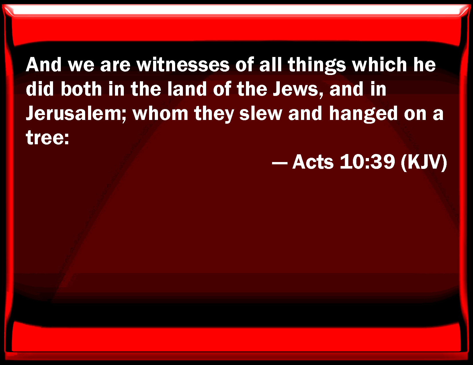 Bible Verse Slide Acts 10:39 And we are witnesses of all things which he did both in the land of the Jews, and in Jerusalem; whom they slew and hanged on a tree: KJV: And we are witnesses of all things which he did both in the land of the Jews, and in Jerusalem; whom they slew and hanged on a tree: DRB: And we are witnesses of all things that he did in the land of the Jews and in Jerusalem, whom they killed, hanging him upon a tree. DBT: We also are witnesses of all things which he did both in the country of the Jews and in Jerusalem; whom they also slew, having hanged him on a cross. ERV: And we are witnesses of all things which he did both in the country of the Jews, and in Jerusalem; whom also they slew, hanging him on a tree. WBT: And we are witnesses of all things which he did, both in the land of the Jews, and in Jerusalem; whom they slew and hanged on a tree. WEB: We are witnesses of everything he did both in the country of the Jews, and in Jerusalem; whom they also killed, hanging him on a tree. YLT: and we — we are witnesses of all things that he did, both in the country of the Jews, and in Jerusalem, — whom they did slay, having hanged upon a tree.Links Acts 10:39 NIV • Acts 10:39 NLT • Acts 10:39 ESV • Acts 10:39 NASB • Acts 10:39 KJV • Acts 10:39 Interlinear • Acts 10:39 Commentaries • Acts 10:39 Parallel Texts • Acts 10:39 Bible Apps • Acts 10:39 Parallel • Bible Hub |