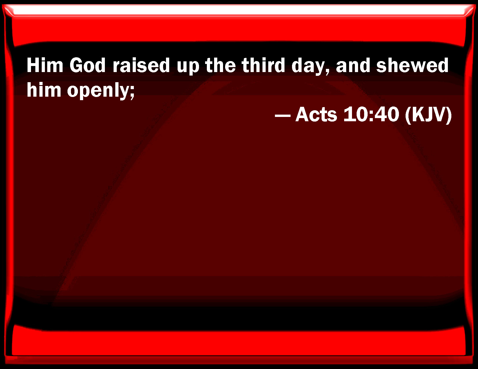 Bible Verse Slide Acts 10:40 Him God raised up the third day, and showed him openly; KJV: Him God raised up the third day, and shewed him openly; DRB: Him God raised up the third day, and gave him to be made manifest, DBT: This man God raised up the third day and gave him to be openly seen, ERV: Him God raised up the third day, and gave him to be made manifest, WBT: Him God raised the third day, and showed him openly; WEB: God raised him up the third day, and gave him to be revealed, YLT: 'This one God did raise up the third day, and gave him to become manifest,Links Acts 10:40 NIV • Acts 10:40 NLT • Acts 10:40 ESV • Acts 10:40 NASB • Acts 10:40 KJV • Acts 10:40 Interlinear • Acts 10:40 Commentaries • Acts 10:40 Parallel Texts • Acts 10:40 Bible Apps • Acts 10:40 Parallel • Bible Hub |