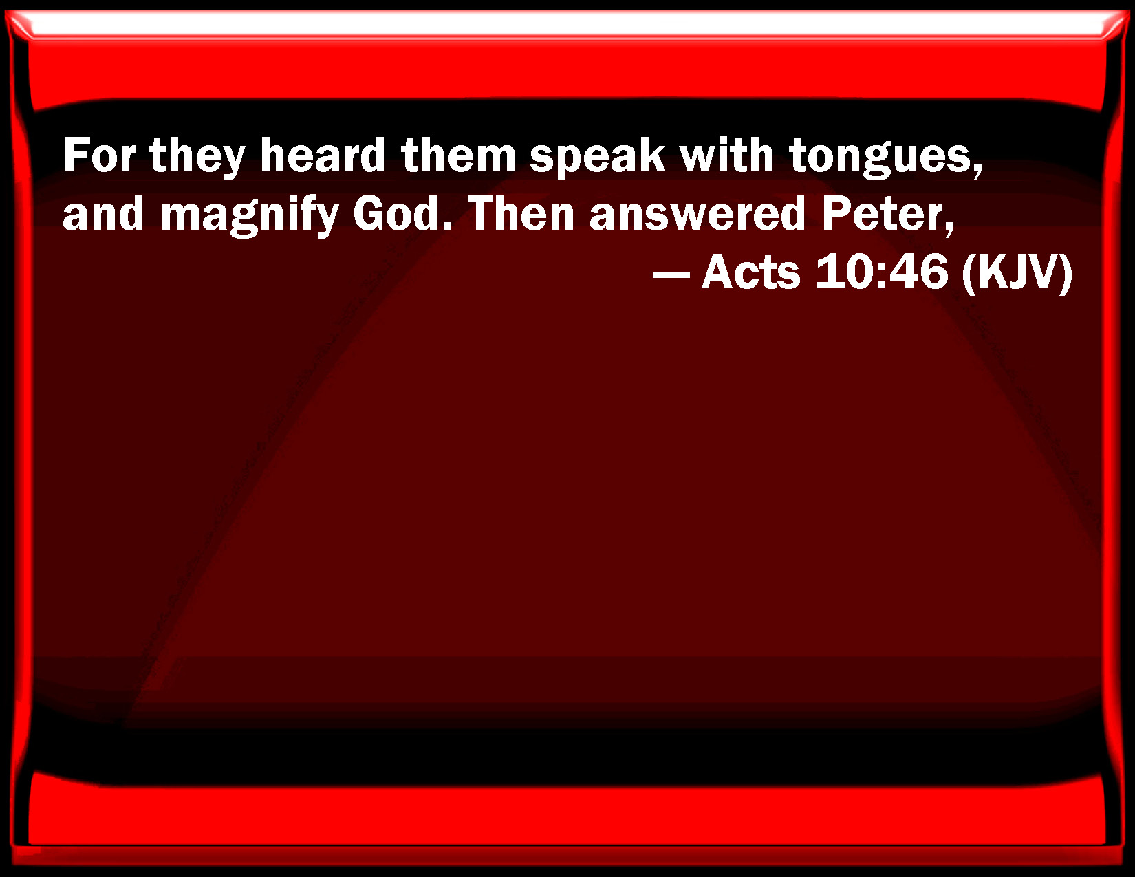 Bible Verse Slide Acts 10:46 For they heard them speak with tongues, and magnify God. Then answered Peter, KJV: For they heard them speak with tongues, and magnify God. Then answered Peter, DRB: For they heard them speaking with tongues, and magnifying God. DBT: for they heard them speaking with tongues and magnifying God. Then Peter answered, ERV: For they heard them speak with tongues, and magnify God. Then answered Peter, WBT: For they heard them speak in languages and magnify God. Then answered Peter, WEB: For they heard them speaking in other languages and magnifying God. Then Peter answered, YLT: for they were hearing them speaking with tongues and magnifying God.Links Acts 10:46 NIV • Acts 10:46 NLT • Acts 10:46 ESV • Acts 10:46 NASB • Acts 10:46 KJV • Acts 10:46 Interlinear • Acts 10:46 Commentaries • Acts 10:46 Parallel Texts • Acts 10:46 Bible Apps • Acts 10:46 Parallel • Bible Hub |