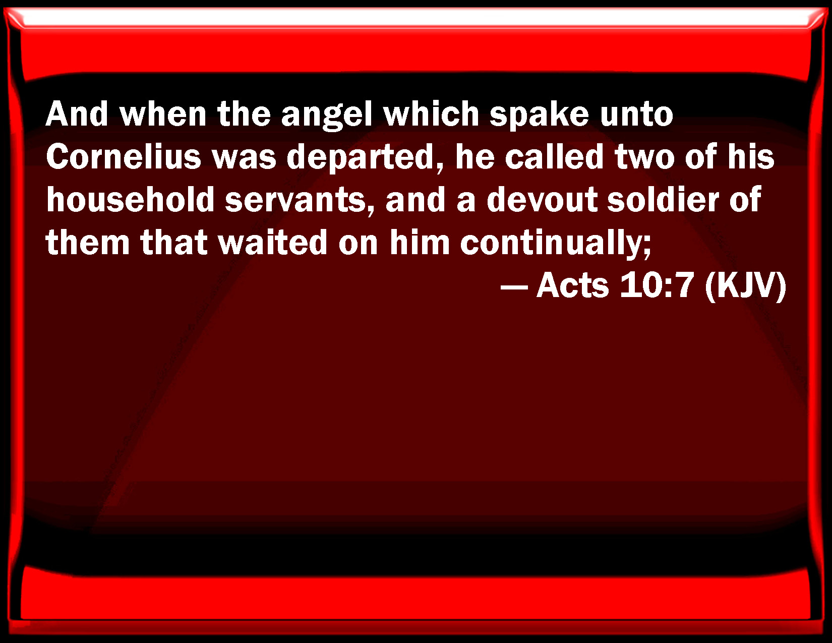 Bible Verse Slide Acts 10:7 And when the angel which spoke to Cornelius was departed, he called two of his household servants, and a devout soldier of them that waited on him continually; KJV: And when the angel which spake unto Cornelius was departed, he called two of his household servants, and a devout soldier of them that waited on him continually; DRB: And when the angel who spoke to him was departed, he called two of his household servants, and a soldier who feared the Lord, of them that were under him. DBT: And when the angel who was speaking to him had departed, having called two of his household and a pious soldier of those who were constantly with him, ERV: And when the angel that spake unto him was departed, he called two of his household-servants, and a devout soldier of them that waited on him continually; WBT: And when the angel who spoke to Cornelius had departed, he called two of his household servants, and a devout soldier of them that waited on him continually; WEB: When the angel who spoke to him had departed, Cornelius called two of his household servants and a devout soldier of those who waited on him continually. YLT: And when the messenger who is speaking to Cornelius went away, having called two of his domestics, and a pious soldier of those waiting on him continually,Links Acts 10:7 NIV • Acts 10:7 NLT • Acts 10:7 ESV • Acts 10:7 NASB • Acts 10:7 KJV • Acts 10:7 Interlinear • Acts 10:7 Commentaries • Acts 10:7 Parallel Texts • Acts 10:7 Bible Apps • Acts 10:7 Parallel • Bible Hub |
