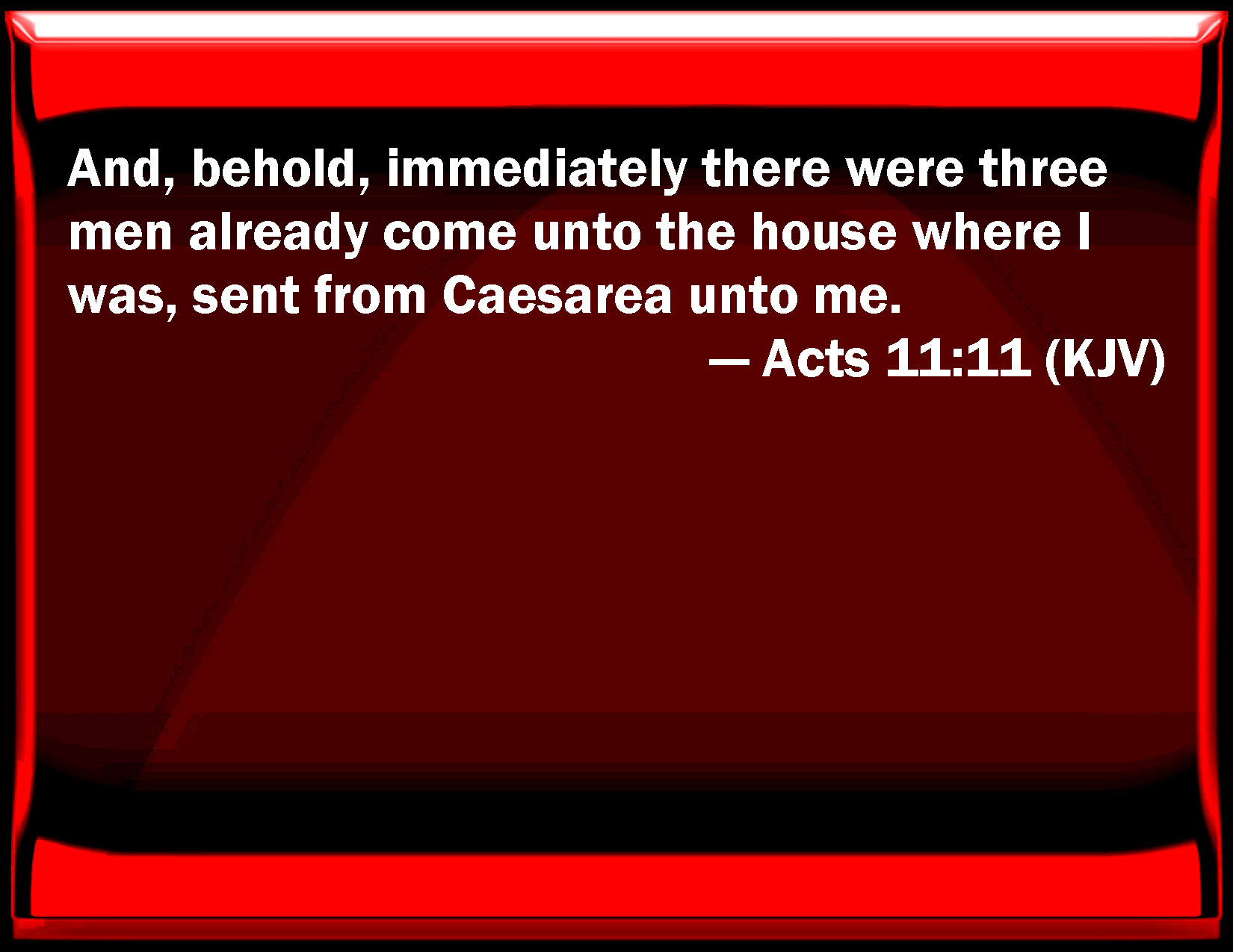 Bible Verse Slide Acts 11:11 And, behold, immediately there were three men already come to the house where I was, sent from Caesarea to me. KJV: And, behold, immediately there were three men already come unto the house where I was, sent from Caesarea unto me. DRB: And behold, immediately there were three men come to the house wherein I was, sent to me from Caesarea. DBT: and lo, immediately three men were at the house in which I was, sent to me from Caesarea. ERV: And behold, forthwith three men stood before the house in which we were, having been sent from Caesarea unto me. WBT: And behold, immediately there were three men already come to the house where I was, sent from Cesarea to me. WEB: Behold, immediately three men stood before the house where I was, having been sent from Caesarea to me. YLT: and, lo, immediately, three men stood at the house in which I was, having been sent from Caesarea unto me,Links Acts 11:11 NIV • Acts 11:11 NLT • Acts 11:11 ESV • Acts 11:11 NASB • Acts 11:11 KJV • Acts 11:11 Interlinear • Acts 11:11 Commentaries • Acts 11:11 Parallel Texts • Acts 11:11 Bible Apps • Acts 11:11 Parallel • Bible Hub |