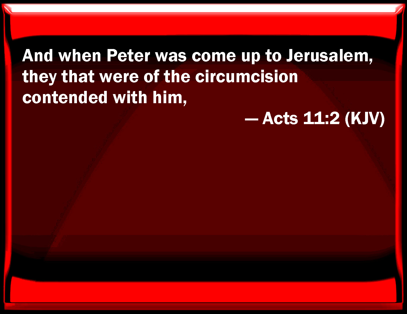 Bible Verse Slide Acts 11:2 And when Peter was come up to Jerusalem, they that were of the circumcision contended with him, KJV: And when Peter was come up to Jerusalem, they that were of the circumcision contended with him, DRB: And when Peter was come up to Jerusalem, they that were of the circumcision contended with him, DBT: and when Peter went up to Jerusalem, they of the circumcision contended with him, ERV: And when Peter was come up to Jerusalem, they that were of the circumcision contended with him, WBT: And when Peter had come to Jerusalem, they that were of the circumcision contended with him, WEB: When Peter had come up to Jerusalem, those who were of the circumcision contended with him, YLT: and when Peter came up to Jerusalem, those of the circumcision were contending with him,Links Acts 11:2 NIV • Acts 11:2 NLT • Acts 11:2 ESV • Acts 11:2 NASB • Acts 11:2 KJV • Acts 11:2 Interlinear • Acts 11:2 Commentaries • Acts 11:2 Parallel Texts • Acts 11:2 Bible Apps • Acts 11:2 Parallel • Bible Hub |