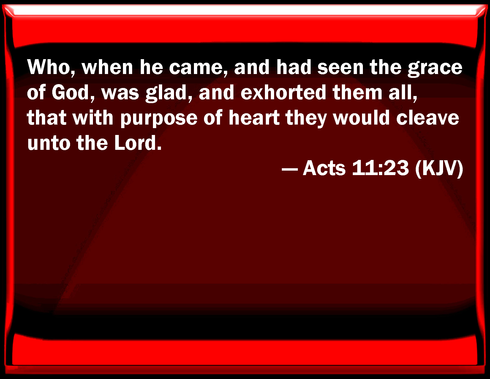 Bible Verse Slide Acts 11:23 Who, when he came, and had seen the grace of God, was glad, and exhorted them all, that with purpose of heart they would hold to the Lord. KJV: Who, when he came, and had seen the grace of God, was glad, and exhorted them all, that with purpose of heart they would cleave unto the Lord. DRB: Who, when he was come, and had seen the grace of God, rejoiced: and he exhorted them all with purpose of heart to continue in the Lord. DBT: who, having arrived and seeing the grace of God, rejoiced, and exhorted all with purpose of heart to abide with the Lord; ERV: who, when he was come, and had seen the grace of God, was glad; and he exhorted them all, that with purpose of heart they would cleave unto the Lord: WBT: Who, when he came, and had seen the grace of God, was glad, and exhorted them all that with purpose of heart they would cleave to the Lord. WEB: who, when he had come, and had seen the grace of God, was glad. He exhorted them all, that with purpose of heart they should remain near to the Lord. YLT: who, having come, and having seen the grace of God, was glad, and was exhorting all with purpose of heart to cleave to the Lord,Links Acts 11:23 NIV • Acts 11:23 NLT • Acts 11:23 ESV • Acts 11:23 NASB • Acts 11:23 KJV • Acts 11:23 Interlinear • Acts 11:23 Commentaries • Acts 11:23 Parallel Texts • Acts 11:23 Bible Apps • Acts 11:23 Parallel • Bible Hub |
