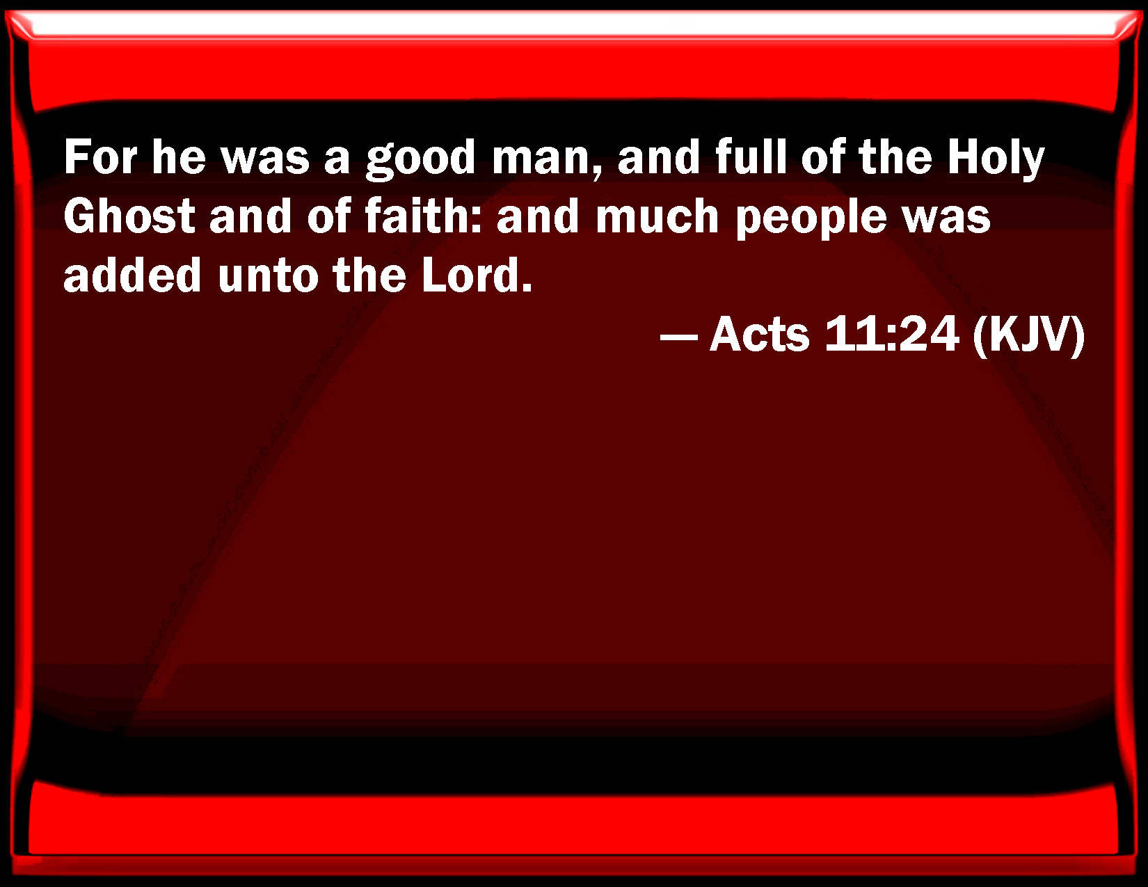 Bible Verse Slide Acts 11:24 For he was a good man, and full of the Holy Ghost and of faith: and much people was added to the Lord. KJV: For he was a good man, and full of the Holy Ghost and of faith: and much people was added unto the Lord. DRB: For he was a good man, and full of the Holy Ghost and of faith. And a great multitude was added to the Lord. DBT: for he was a good man and full of the Holy Spirit and of faith; and a large crowd of people were added to the Lord. ERV: for he was a good man, and full of the Holy Ghost and of faith: and much people was added unto the Lord. WBT: For he was a good man, and full of the Holy Spirit, and of faith: and many people were added to the Lord. WEB: For he was a good man, and full of the Holy Spirit and of faith, and many people were added to the Lord. YLT: because he was a good man, and full of the Holy Spirit, and of faith, and a great multitude was added to the Lord.Links Acts 11:24 NIV • Acts 11:24 NLT • Acts 11:24 ESV • Acts 11:24 NASB • Acts 11:24 KJV • Acts 11:24 Interlinear • Acts 11:24 Commentaries • Acts 11:24 Parallel Texts • Acts 11:24 Bible Apps • Acts 11:24 Parallel • Bible Hub |