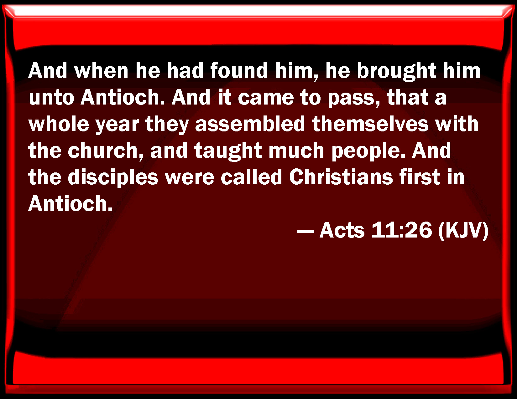 Bible Verse Slide Acts 11:26 And when he had found him, he brought him to Antioch. And it came to pass, that a whole year they assembled themselves with the church, and taught much people. And the disciples were called Christians first in Antioch. KJV: And when he had found him, he brought him unto Antioch. And it came to pass, that a whole year they assembled themselves with the church, and taught much people. And the disciples were called Christians first in Antioch. DRB: And they conversed there in the church a whole year; and they taught a great multitude, so that at Antioch the disciples were first named Christians. DBT: And having found him, he brought him to Antioch. And so it was with them that for a whole year they were gathered together in the assembly and taught a large crowd: and the disciples were first called Christians in Antioch. ERV: and when he had found him, he brought him unto Antioch. And it came to pass, that even for a whole year they were gathered together with the church, and taught much people; and that the disciples were called Christians first in Antioch. WBT: And when he had found him, he brought him to Antioch. And it came to pass, that a whole year they assembled themselves with the church, and taught many people. And the disciples were first called Christians in Antioch. WEB: When he had found him, he brought him to Antioch. It happened, that for a whole year they were gathered together with the assembly, and taught many people. The disciples were first called Christians in Antioch. YLT: and having found him, he brought him to Antioch, and it came to pass that they a whole year did assemble together in the assembly, and taught a great multitude, the disciples also were divinely called first in Antioch Christians.Links Acts 11:26 NIV • Acts 11:26 NLT • Acts 11:26 ESV • Acts 11:26 NASB • Acts 11:26 KJV • Acts 11:26 Interlinear • Acts 11:26 Commentaries • Acts 11:26 Parallel Texts • Acts 11:26 Bible Apps • Acts 11:26 Parallel • Bible Hub |
