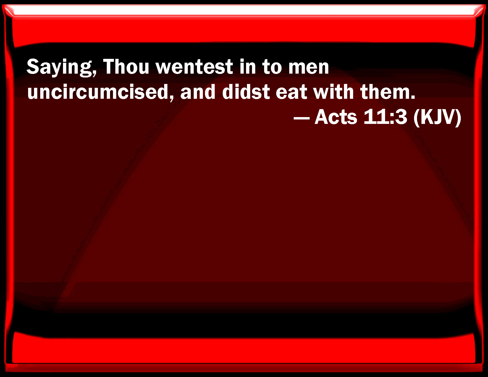 Bible Verse Slide Acts 11:3 Saying, You went in to men uncircumcised, and did eat with them. KJV: Saying, Thou wentest in to men uncircumcised, and didst eat with them. DRB: Saying: Why didst thou go in to men uncircumcised, and didst eat with them? DBT: saying, Thou wentest in to men uncircumcised and hast eaten with them. ERV: saying, Thou wentest in to men uncircumcised, and didst eat with them. WBT: Saying, Thou wentest in to men uncircumcised, and didst eat with them. WEB: saying, "You went in to uncircumcised men, and ate with them!" YLT: saying — 'Unto men uncircumcised thou didst go in, and didst eat with them!'Links Acts 11:3 NIV • Acts 11:3 NLT • Acts 11:3 ESV • Acts 11:3 NASB • Acts 11:3 KJV • Acts 11:3 Interlinear • Acts 11:3 Commentaries • Acts 11:3 Parallel Texts • Acts 11:3 Bible Apps • Acts 11:3 Parallel • Bible Hub |