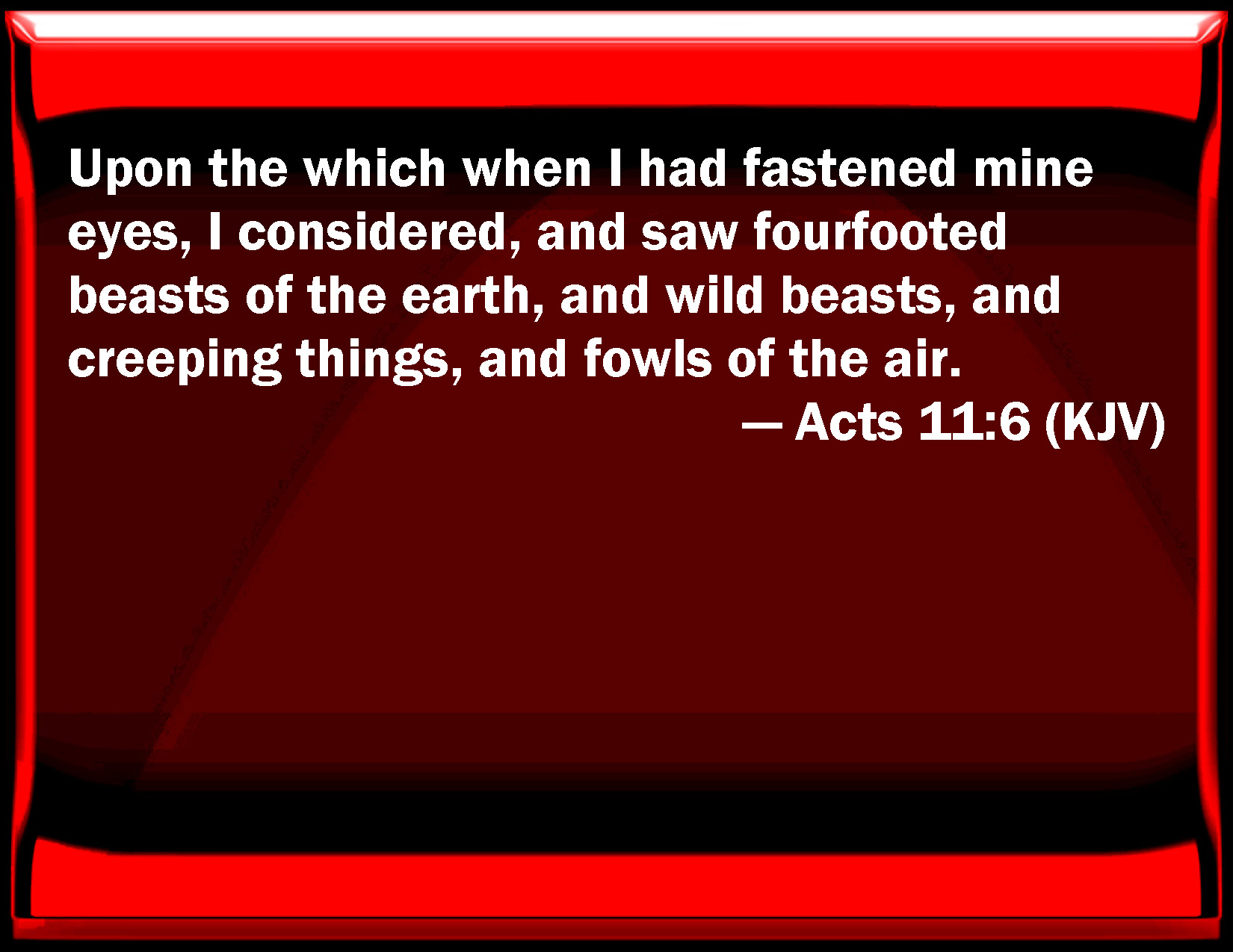 Bible Verse Slide Acts 11:6 On the which when I had fastened my eyes, I considered, and saw four footed beasts of the earth, and wild beasts, and creeping things, and fowls of the air. KJV: Upon the which when I had fastened mine eyes, I considered, and saw fourfooted beasts of the earth, and wild beasts, and creeping things, and fowls of the air. DRB: Into which looking, I considered, and saw fourfooted creatures of the earth, and beasts, and creeping things, and fowls of the air: DBT: on which having fixed mine eyes, I considered, and saw the quadrupeds of the earth, and the wild beasts, and the creeping things, and the fowls of the heaven. ERV: upon the which when I had fastened mine eyes, I considered, and saw the fourfooted beasts of the earth and wild beasts and creeping things and fowls of the heaven. WBT: Upon which when I had fastened my eyes, I considered, and saw four-footed beasts of the earth, and wild beasts, and creeping animals, and fowls of the air. WEB: When I had looked intently at it, I considered, and saw the four-footed animals of the earth, wild animals, creeping things, and birds of the sky. YLT: at which having looked stedfastly, I was considering, and I saw the four-footed beasts of the earth, and the wild beasts, and the creeping things, and the fowls of heaven;Links Acts 11:6 NIV • Acts 11:6 NLT • Acts 11:6 ESV • Acts 11:6 NASB • Acts 11:6 KJV • Acts 11:6 Interlinear • Acts 11:6 Commentaries • Acts 11:6 Parallel Texts • Acts 11:6 Bible Apps • Acts 11:6 Parallel • Bible Hub |