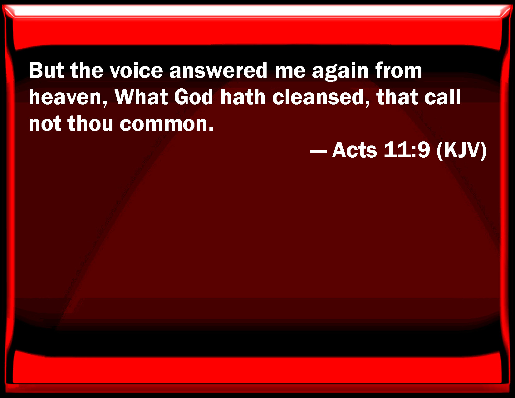 Bible Verse Slide Acts 11:9 But the voice answered me again from heaven, What God has cleansed, that call not you common. KJV: But the voice answered me again from heaven, What God hath cleansed, that call not thou common. DRB: And the voice answered again from heaven: What God hath made clean, do not thou call common. DBT: And a voice answered the second time out of heaven, What God has cleansed, do not thou make common. ERV: But a voice answered the second time out of heaven, What God hath cleansed, make not thou common. WBT: But the voice answered me again from heaven, What God hath cleansed, that call not thou common. WEB: But a voice answered me the second time out of heaven, 'What God has cleansed, don't you call unclean.' YLT: and a voice did answer me a second time out of the heaven, What God did cleanse, thou — declare not thou common.Links Acts 11:9 NIV • Acts 11:9 NLT • Acts 11:9 ESV • Acts 11:9 NASB • Acts 11:9 KJV • Acts 11:9 Interlinear • Acts 11:9 Commentaries • Acts 11:9 Parallel Texts • Acts 11:9 Bible Apps • Acts 11:9 Parallel • Bible Hub |