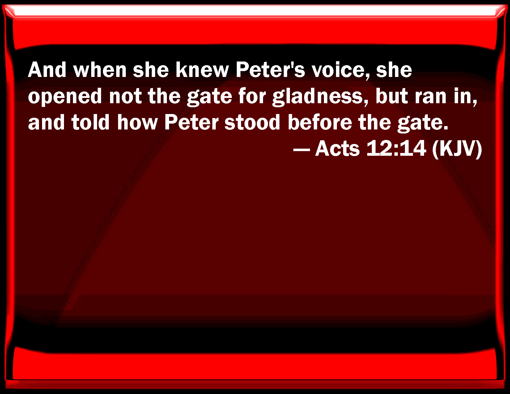 Bible Verse Slide Acts 12:14 And when she knew Peter's voice, she opened not the gate for gladness, but ran in, and told how Peter stood before the gate. KJV: And when she knew Peter's voice, she opened not the gate for gladness, but ran in, and told how Peter stood before the gate. DRB: And as soon as she knew Peter's voice, she opened not the gate for joy, but running in she told that Peter stood before the gate. DBT: and having recognised the voice of Peter, through joy did not open the entry, but running in, reported that Peter was standing before the entry. ERV: And when she knew Peter's voice, she opened not the gate for joy, but ran in, and told that Peter stood before the gate. WBT: And when she knew Peter's voice, she opened not the gate for gladness, but ran in, and told that Peter stood before the gate WEB: When she recognized Peter's voice, she didn't open the gate for joy, but ran in, and reported that Peter was standing in front of the gate. YLT: and having known the voice of Peter, from the joy she did not open the porch, but having run in, told of the standing of Peter before the porch,Links Acts 12:14 NIV • Acts 12:14 NLT • Acts 12:14 ESV • Acts 12:14 NASB • Acts 12:14 KJV • Acts 12:14 Interlinear • Acts 12:14 Commentaries • Acts 12:14 Parallel Texts • Acts 12:14 Bible Apps • Acts 12:14 Parallel • Bible Hub |