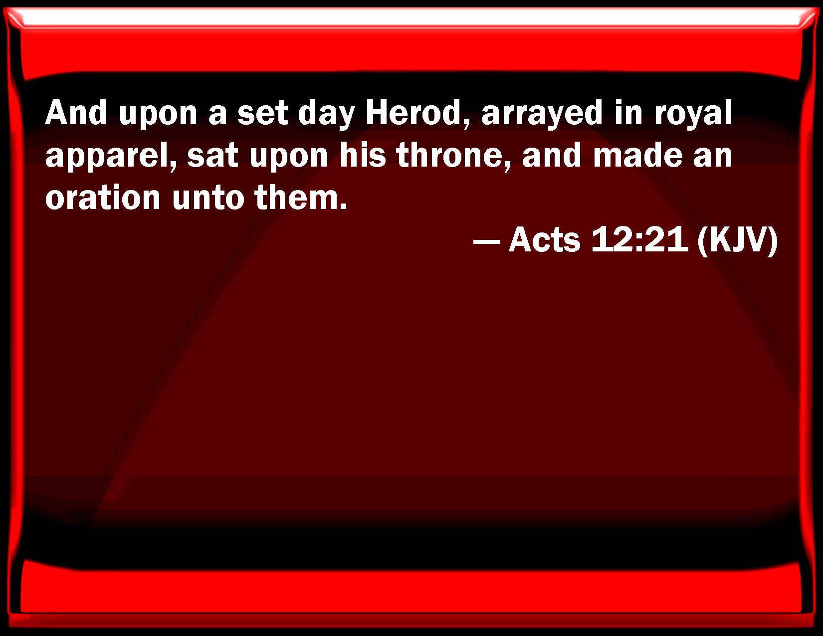 Bible Verse Slide Acts 12:21 And on a set day Herod, arrayed in royal apparel, sat on his throne, and made an oration to them. KJV: And upon a set day Herod, arrayed in royal apparel, sat upon his throne, and made an oration unto them. DRB: And upon a day appointed, Herod being arrayed in kingly apparel, sat in the judgment seat, and made an oration to them. DBT: And on a set day, clothed in royal apparel and sitting on the elevated seat of honour, Herod made a public oration to them. ERV: And upon a set day Herod arrayed himself in royal apparel, and sat on the throne, and made an oration unto them. WBT: And upon a set day, Herod arrayed in royal apparel, sat upon his throne, and made an oration to them. WEB: On an appointed day, Herod dressed himself in royal clothing, sat on the throne, and gave a speech to them. YLT: and on a set day, Herod having arrayed himself in kingly apparel, and having sat down upon the tribunal, was making an oration unto them,Links Acts 12:21 NIV • Acts 12:21 NLT • Acts 12:21 ESV • Acts 12:21 NASB • Acts 12:21 KJV • Acts 12:21 Interlinear • Acts 12:21 Commentaries • Acts 12:21 Parallel Texts • Acts 12:21 Bible Apps • Acts 12:21 Parallel • Bible Hub |
