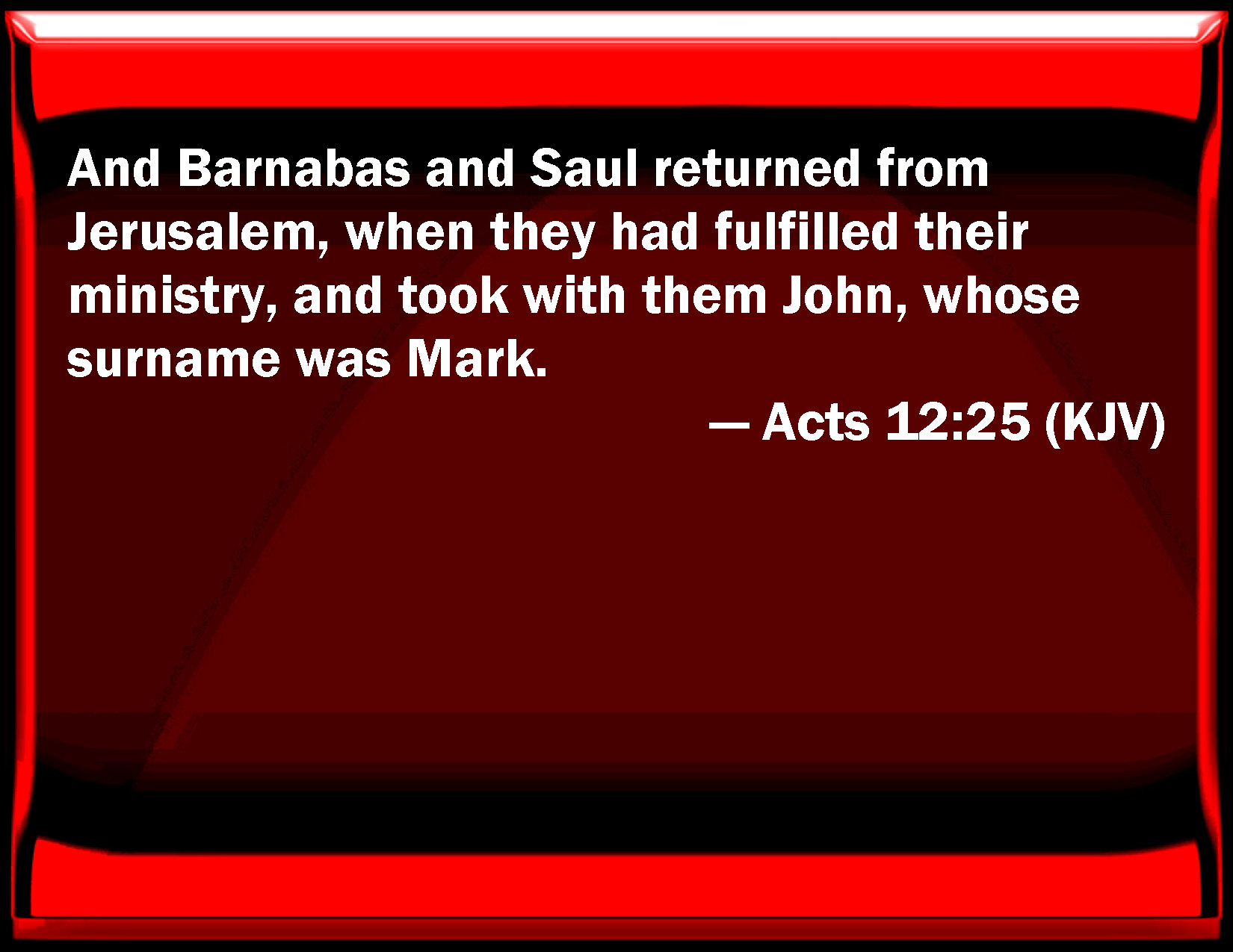 Bible Verse Slide Acts 12:25 And Barnabas and Saul returned from Jerusalem, when they had fulfilled their ministry, and took with them John, whose surname was Mark. KJV: And Barnabas and Saul returned from Jerusalem, when they had fulfilled their ministry, and took with them John, whose surname was Mark. DRB: And Barnabas and Saul returned from Jerusalem, having fulfilled their ministry, taking with them John, who was surnamed Mark. DBT: And Barnabas and Saul returned from Jerusalem, having fulfilled the service entrusted to them, taking also with them John, surnamed Mark. ERV: And Barnabas and Saul returned from Jerusalem, when they had fulfilled their ministration, taking with them John whose surname was Mark. WBT: And Barnabas and Saul returned from Jerusalem, when they had fulfilled their ministry, and took with them John, whose surname was Mark. WEB: Barnabas and Saul returned to Jerusalem, when they had fulfilled their service, also taking with them John whose surname was Mark. YLT: and Barnabas and Saul did turn back out of Jerusalem, having fulfilled the ministration, having taken also with them John, who was surnamed Mark.Links Acts 12:25 NIV • Acts 12:25 NLT • Acts 12:25 ESV • Acts 12:25 NASB • Acts 12:25 KJV • Acts 12:25 Interlinear • Acts 12:25 Commentaries • Acts 12:25 Parallel Texts • Acts 12:25 Bible Apps • Acts 12:25 Parallel • Bible Hub |