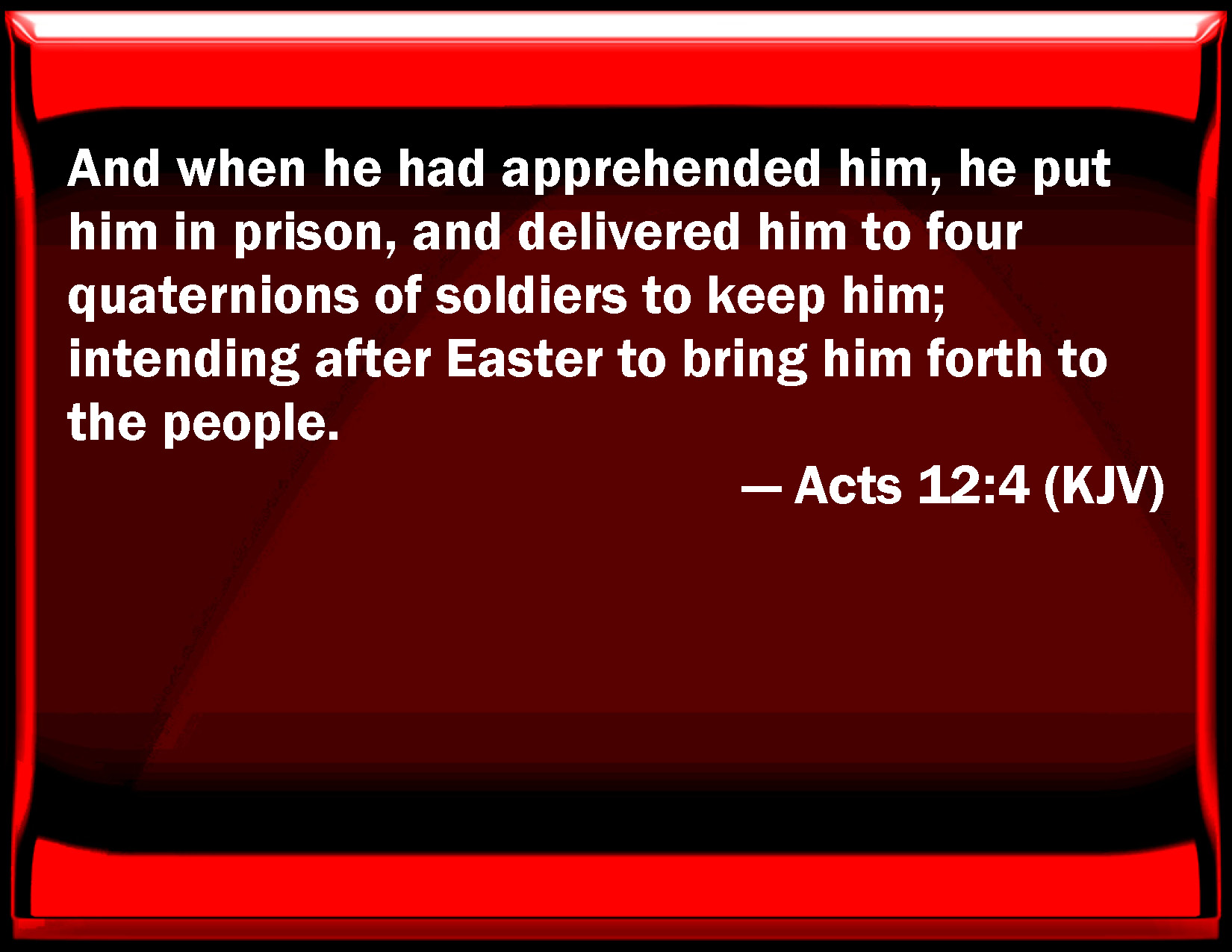 Bible Verse Slide Acts 12:4 And when he had apprehended him, he put him in prison, and delivered him to four squads of soldiers to keep him; intending after Easter to bring him forth to the people. KJV: And when he had apprehended him, he put him in prison, and delivered him to four quaternions of soldiers to keep him; intending after Easter to bring him forth to the people. DRB: And when he had apprehended him, he cast him into prison, delivering him to four files of soldiers to be kept, intending, after the pasch, to bring him forth to the people. DBT: whom having seized he put in prison, having delivered him to four quaternions of soldiers to keep, purposing after the passover to bring him out to the people. ERV: And when he had taken him, he put him in prison, and delivered him to four quaternions of soldiers to guard him; intending after the Passover to bring him forth to the people. WBT: And when he had apprehended him, he put him in prison, and delivered him to four quaternions of soldiers to keep him; intending after the passover to bring him forth to the people. WEB: When he had arrested him, he put him in prison, and delivered him to four squads of four soldiers each to guard him, intending to bring him out to the people after the Passover. YLT: whom also having seized, he did put in prison, having delivered him to four quaternions of soldiers to guard him, intending after the passover to bring him forth to the people.Links Acts 12:4 NIV • Acts 12:4 NLT • Acts 12:4 ESV • Acts 12:4 NASB • Acts 12:4 KJV • Acts 12:4 Interlinear • Acts 12:4 Commentaries • Acts 12:4 Parallel Texts • Acts 12:4 Bible Apps • Acts 12:4 Parallel • Bible Hub |