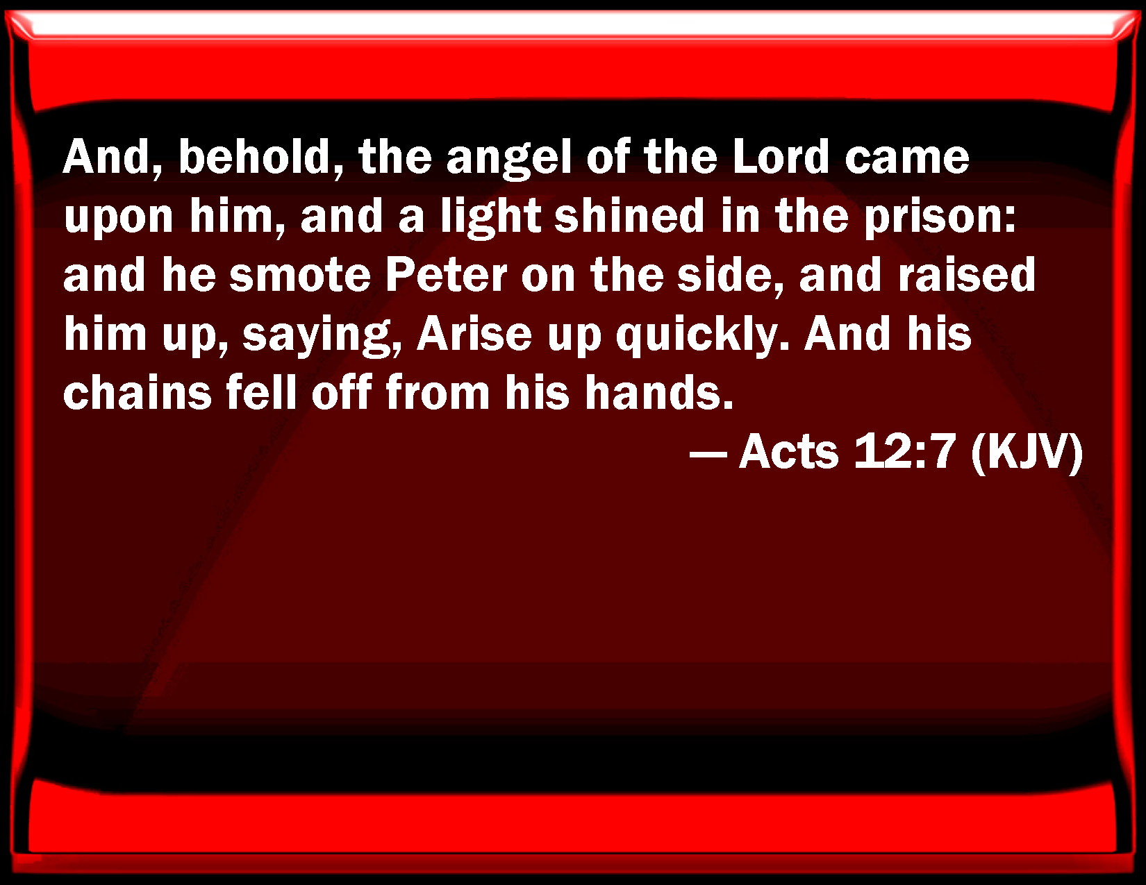 Bible Verse Slide Acts 12:7 And, behold, the angel of the Lord came on him, and a light shined in the prison: and he smote Peter on the side, and raised him up, saying, Arise up quickly. And his chains fell off from his hands. KJV: And, behold, the angel of the Lord came upon him, and a light shined in the prison: and he smote Peter on the side, and raised him up, saying, Arise up quickly. And his chains fell off from his hands. DRB: And behold an angel of the Lord stood by him: and a light shined in the room: and he striking Peter on the side, raised him up, saying: Arise quickly. And the chains fell off from his hands. DBT: And lo, an angel of the Lord came there, and a light shone in the prison: and having smitten the side of Peter, he roused him up, saying, Rise up quickly. And his chains fell off his hands. ERV: And behold, an angel of the Lord stood by him, and a light shined in the cell: and he smote Peter on the side, and awoke him, saying, Rise up quickly. And his chains fell off from his hands. WBT: And behold, the angel of the Lord came upon him, and a light shined in the prison; and he smote Peter on the side, and raised him up, saying, Arise quickly. And his chains fell off from his hands. WEB: And behold, an angel of the Lord stood by him, and a light shone in the cell. He struck Peter on the side, and woke him up, saying, "Stand up quickly!" His chains fell off from his hands. YLT: and lo, a messenger of the Lord stood by, and a light shone in the buildings, and having smitten Peter on the side, he raised him up, saying, 'Rise in haste,' and his chains fell from off his hands.Links Acts 12:7 NIV • Acts 12:7 NLT • Acts 12:7 ESV • Acts 12:7 NASB • Acts 12:7 KJV • Acts 12:7 Interlinear • Acts 12:7 Commentaries • Acts 12:7 Parallel Texts • Acts 12:7 Bible Apps • Acts 12:7 Parallel • Bible Hub |