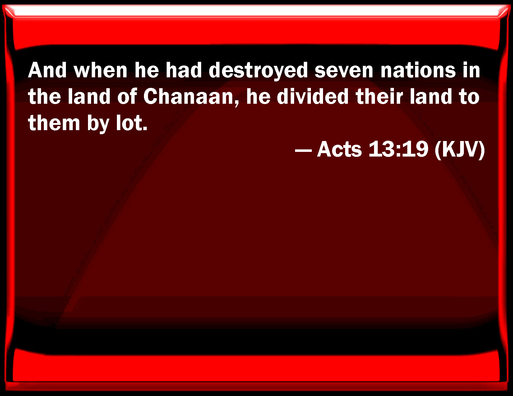 Bible Verse Slide Acts 13:19 And when he had destroyed seven nations in the land of Chanaan, he divided their land to them by lot. KJV: And when he had destroyed seven nations in the land of Chanaan, he divided their land to them by lot. DRB: And destroying seven nations in the land of Chanaan, divided their land among them, by lot, DBT: And having destroyed seven nations in the land of Canaan, he gave them their land as an inheritance. ERV: And when he had destroyed seven nations in the land of Canaan, he gave them their land for an inheritance, for about four hundred and fifty years: WBT: And when he had destroyed seven nations in the land of Canaan, he divided their land to them by lot. WEB: When he had destroyed seven nations in the land of Canaan, he gave them their land for an inheritance, for about four hundred fifty years. YLT: and having destroyed seven nations in the land of Canaan, He did divide by lot to them their land.Links Acts 13:19 NIV • Acts 13:19 NLT • Acts 13:19 ESV • Acts 13:19 NASB • Acts 13:19 KJV • Acts 13:19 Interlinear • Acts 13:19 Commentaries • Acts 13:19 Parallel Texts • Acts 13:19 Bible Apps • Acts 13:19 Parallel • Bible Hub |