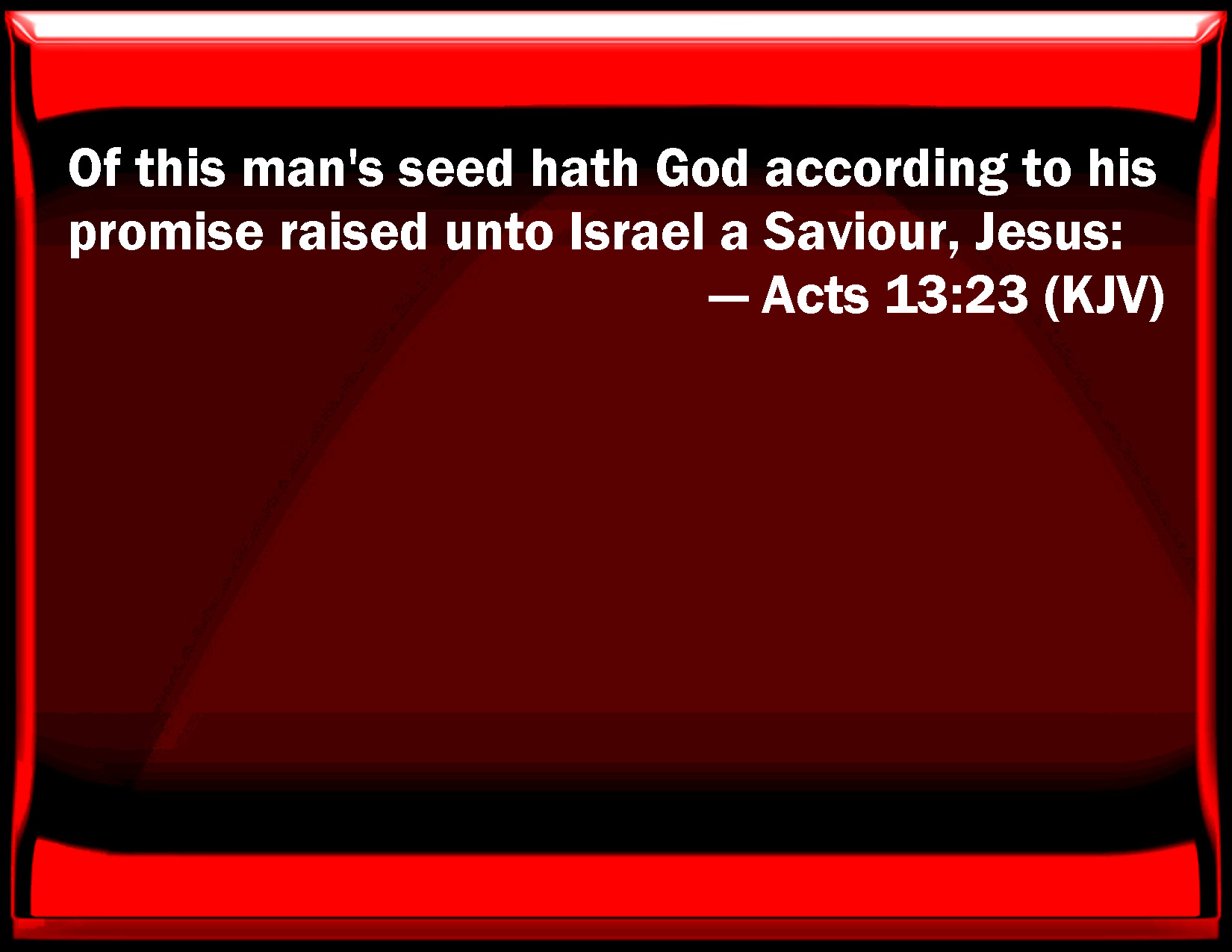 Bible Verse Slide Acts 13:23 Of this man's seed has God according to his promise raised to Israel a Savior, Jesus: KJV: Of this man's seed hath God according to his promise raised unto Israel a Saviour, Jesus: DRB: Of this man's seed God according to his promise, hath raised up to Israel a Saviour, Jesus: DBT: Of this man's seed according to promise has God brought to Israel a Saviour, Jesus; ERV: Of this man's seed hath God according to promise brought unto Israel a Saviour, Jesus; WBT: Of this man's offspring hath God, according to his promise, raised up to Israel a Savior, Jesus: WEB: From this man's seed, God has brought salvation to Israel according to his promise, YLT: Of this one's seed God, according to promise, did raise to Israel a Saviour — Jesus,Links Acts 13:23 NIV • Acts 13:23 NLT • Acts 13:23 ESV • Acts 13:23 NASB • Acts 13:23 KJV • Acts 13:23 Interlinear • Acts 13:23 Commentaries • Acts 13:23 Parallel Texts • Acts 13:23 Bible Apps • Acts 13:23 Parallel • Bible Hub |