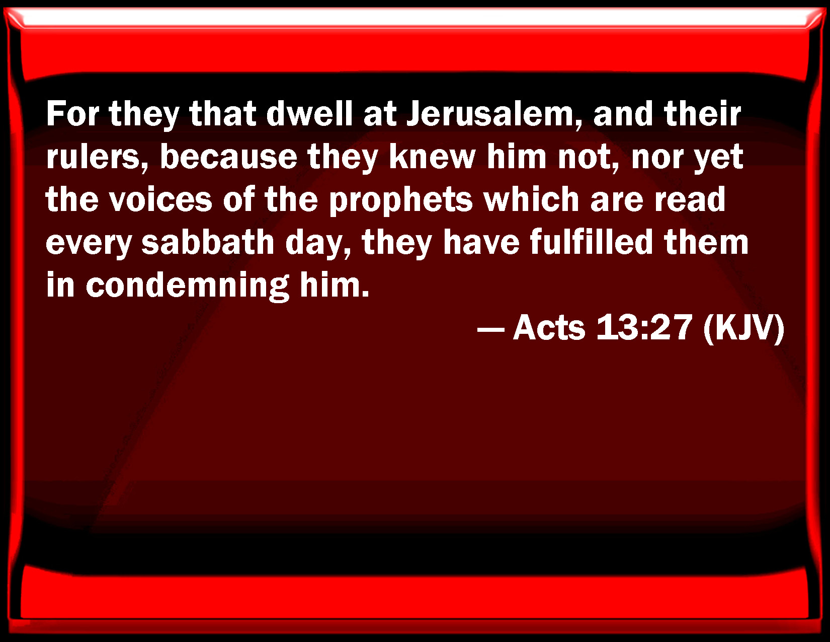 Bible Verse Slide Acts 13:27 For they that dwell at Jerusalem, and their rulers, because they knew him not, nor yet the voices of the prophets which are read every sabbath day, they have fulfilled them in condemning him. KJV: For they that dwell at Jerusalem, and their rulers, because they knew him not, nor yet the voices of the prophets which are read every sabbath day, they have fulfilled them in condemning him. DRB: For they that inhabited Jerusalem, and the rulers thereof, not knowing him, nor the voices of the prophets, which are read every sabbath, judging him have fulfilled them. DBT: for those who dwell in Jerusalem, and their rulers, not having known him, have fulfilled also the voices of the prophets which are read on every sabbath, by judging him. ERV: For they that dwell in Jerusalem, and their rulers, because they knew him not, nor the voices of the prophets which are read every sabbath, fulfilled them by condemning him. WBT: For they that dwell at Jerusalem, and their rulers, because they knew him not, nor yet the words of the prophets which are read every sabbath, they have fulfilled them in condemning him. WEB: For those who dwell in Jerusalem, and their rulers, because they didn't know him, nor the voices of the prophets which are read every Sabbath, fulfilled them by condemning him. YLT: for those dwelling in Jerusalem, and their chiefs, this one not having known, also the voices of the prophets, which every sabbath are being read — having judged him — did fulfil,Links Acts 13:27 NIV • Acts 13:27 NLT • Acts 13:27 ESV • Acts 13:27 NASB • Acts 13:27 KJV • Acts 13:27 Interlinear • Acts 13:27 Commentaries • Acts 13:27 Parallel Texts • Acts 13:27 Bible Apps • Acts 13:27 Parallel • Bible Hub |