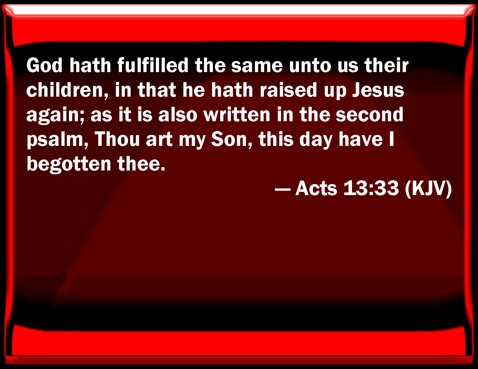 Bible Verse Slide Acts 13:33 God has fulfilled the same to us their children, in that he has raised up Jesus again; as it is also written in the second psalm, You are my Son, this day have I begotten you. KJV: God hath fulfilled the same unto us their children, in that he hath raised up Jesus again; as it is also written in the second psalm, Thou art my Son, this day have I begotten thee. DRB: This same God hath fulfilled to our children, raising up Jesus, as in the second psalm also is written: Thou art my Son, this day have I begotten thee. DBT: that God has fulfilled this to us their children, having raised up Jesus; as it is also written in the second psalm, Thou art my Son: this day have I begotten thee. ERV: how that God hath fulfilled the same unto our children, in that he raised up Jesus; as also it is written in the second psalm, Thou art my Son, this day have I begotten thee. WBT: God hath fulfilled the same to us their children, in that he hath raised up Jesus again; as it is also written in the second psalm, Thou art my Son, this day have I begotten thee. WEB: that God has fulfilled the same to us, their children, in that he raised up Jesus. As it is also written in the second psalm, 'You are my Son. Today I have become your father.' YLT: God hath in full completed this to us their children, having raised up Jesus, as also in the second Psalm it hath been written, My Son thou art — I to-day have begotten thee.Links Acts 13:33 NIV • Acts 13:33 NLT • Acts 13:33 ESV • Acts 13:33 NASB • Acts 13:33 KJV • Acts 13:33 Interlinear • Acts 13:33 Commentaries • Acts 13:33 Parallel Texts • Acts 13:33 Bible Apps • Acts 13:33 Parallel • Bible Hub |