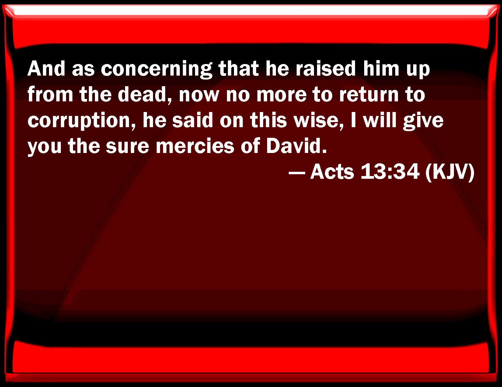 Bible Verse Slide Acts 13:34 And as concerning that he raised him up from the dead, now no more to return to corruption, he said on this wise, I will give you the sure mercies of David. KJV: And as concerning that he raised him up from the dead, now no more to return to corruption, he said on this wise, I will give you the sure mercies of David. DRB: And to shew that he raised him up from the dead, not to return now any more to corruption, he said thus: I will give you the holy things of David faithful. DBT: But that he raised him from among the dead, no more to return to corruption, he spoke thus: I will give to you the faithful mercies of David. ERV: And as concerning that he raised him up from the dead, now no more to return to corruption, he hath spoken on this wise, I will give you the holy and sure blessings of David. WBT: And as concerning that he raised him from the dead, now no more to return to corruption, he said on this wise, I will give you the sure mercies of David. WEB: "Concerning that he raised him up from the dead, now no more to return to corruption, he has spoken thus: 'I will give you the holy and sure blessings of David.' YLT: And that He did raise him up out of the dead, no more to return to corruption, he hath said thus — I will give to you the faithful kindnesses of David;Links Acts 13:34 NIV • Acts 13:34 NLT • Acts 13:34 ESV • Acts 13:34 NASB • Acts 13:34 KJV • Acts 13:34 Interlinear • Acts 13:34 Commentaries • Acts 13:34 Parallel Texts • Acts 13:34 Bible Apps • Acts 13:34 Parallel • Bible Hub |