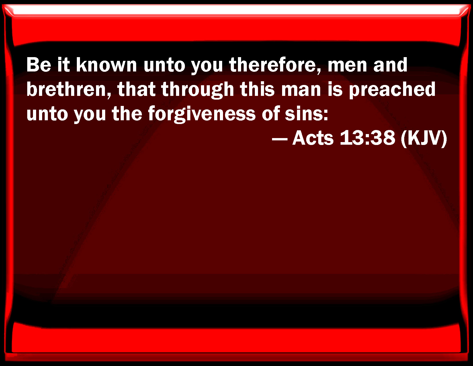 Bible Verse Slide Acts 13:38 Be it known to you therefore, men and brothers, that through this man is preached to you the forgiveness of sins: KJV: Be it known unto you therefore, men and brethren, that through this man is preached unto you the forgiveness of sins: DRB: Be it known therefore to you, men, brethren, that through him forgiveness of sins is preached to you: and from all the things, from which you could not be justified by the law of Moses. DBT: Be it known unto you, therefore, brethren, that through this man remission of sins is preached to you, ERV: Be it known unto you therefore, brethren, that through this man is proclaimed unto you remission of sins: WBT: Be it known to you therefore, men, brethren, that through this man is preached to you the forgiveness of sins; WEB: Be it known to you therefore, brothers, that through this man is proclaimed to you remission of sins, YLT: 'Let it therefore be known to you, men, brethren, that through this one to you is the forgiveness of sins declared,Links Acts 13:38 NIV • Acts 13:38 NLT • Acts 13:38 ESV • Acts 13:38 NASB • Acts 13:38 KJV • Acts 13:38 Interlinear • Acts 13:38 Commentaries • Acts 13:38 Parallel Texts • Acts 13:38 Bible Apps • Acts 13:38 Parallel • Bible Hub |