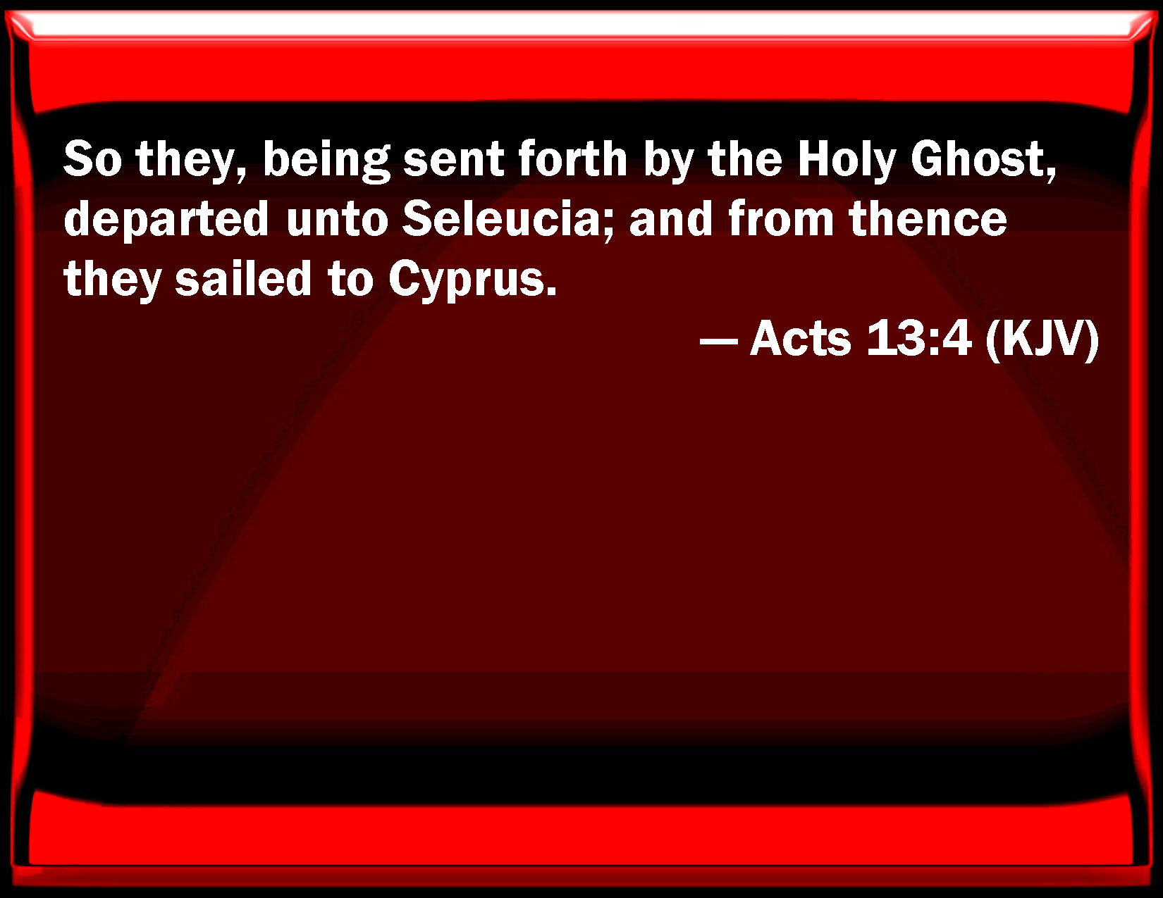 Bible Verse Slide Acts 13:4 So they, being sent forth by the Holy Ghost, departed to Seleucia; and from there they sailed to Cyprus. KJV: So they, being sent forth by the Holy Ghost, departed unto Seleucia; and from thence they sailed to Cyprus. DRB: So they being sent by the Holy Ghost, went to Seleucia: and from thence they sailed to Cyprus. DBT: They therefore, having been sent forth by the Holy Spirit, went down to Seleucia, and thence sailed away to Cyprus. ERV: So they, being sent forth by the Holy Ghost, went down to Seleucia; and from thence they sailed to Cyprus. WBT: So they being sent forth by the Holy Spirit, departed to Seleucia; and from thence they sailed to Cyprus. WEB: So, being sent out by the Holy Spirit, they went down to Seleucia. From there they sailed to Cyprus. YLT: These, indeed, then, having been sent forth by the Holy Spirit, went down to Seleucia, thence also they sailed to Cyprus,Links Acts 13:4 NIV • Acts 13:4 NLT • Acts 13:4 ESV • Acts 13:4 NASB • Acts 13:4 KJV • Acts 13:4 Interlinear • Acts 13:4 Commentaries • Acts 13:4 Parallel Texts • Acts 13:4 Bible Apps • Acts 13:4 Parallel • Bible Hub |