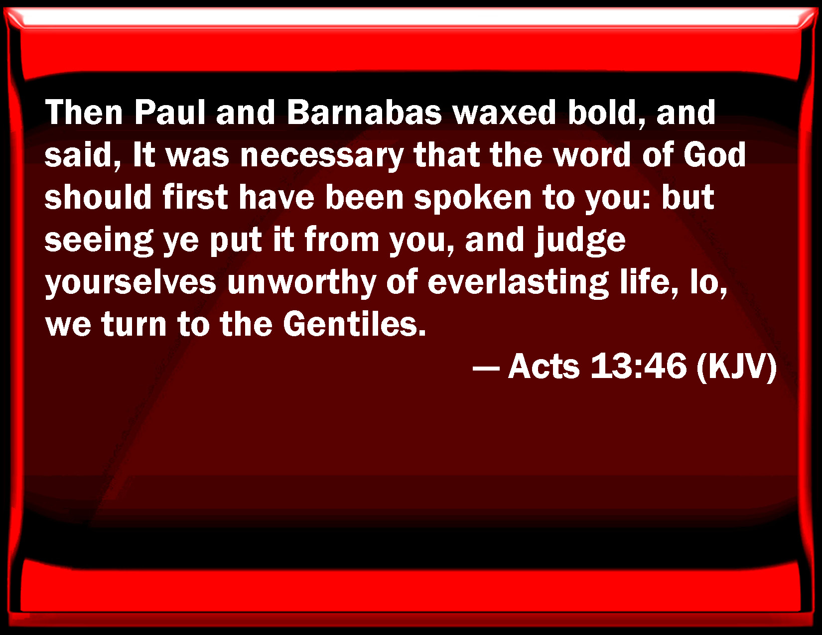 Bible Verse Slide Acts 13:46 Then Paul and Barnabas waxed bold, and said, It was necessary that the word of God should first have been spoken to you: but seeing you put it from you, and judge yourselves unworthy of everlasting life, see, we turn to the Gentiles. KJV: Then Paul and Barnabas waxed bold, and said, It was necessary that the word of God should first have been spoken to you: but seeing ye put it from you, and judge yourselves unworthy of everlasting life, lo, we turn to the Gentiles. DRB: Then Paul and Barnabas said boldly: To you it behoved us first to speak the word of God: but because you reject it, and judge yourselves unworthy of eternal life, behold we turn to the Gentiles. DBT: And Paul and Barnabas spoke boldly and said, It was necessary that the word of God should be first spoken to you; but, since ye thrust it from you, and judge yourselves unworthy of eternal life, lo, we turn to the nations; ERV: And Paul and Barnabas spake out boldly, and said, It was necessary that the word of God should first be spoken to you. Seeing ye thrust it from you, and judge yourselves unworthy of eternal life, lo, we turn to the Gentiles. WBT: Then Paul and Barnabas became bold, and said, It was necessary that the word of God should first be spoken to you: but seeing ye reject it, and judge yourselves unworthy of everlasting life, lo, we turn to the Gentiles. WEB: Paul and Barnabas spoke out boldly, and said, "It was necessary that God's word should be spoken to you first. Since indeed you thrust it from you, and judge yourselves unworthy of eternal life, behold, we turn to the Gentiles. YLT: And speaking boldly, Paul and Barnabas said, 'To you it was necessary that first the word of God be spoken, and seeing ye do thrust it away, and do not judge yourselves worthy of the life age-during, lo, we do turn to the nations;Links Acts 13:46 NIV • Acts 13:46 NLT • Acts 13:46 ESV • Acts 13:46 NASB • Acts 13:46 KJV • Acts 13:46 Interlinear • Acts 13:46 Commentaries • Acts 13:46 Parallel Texts • Acts 13:46 Bible Apps • Acts 13:46 Parallel • Bible Hub |