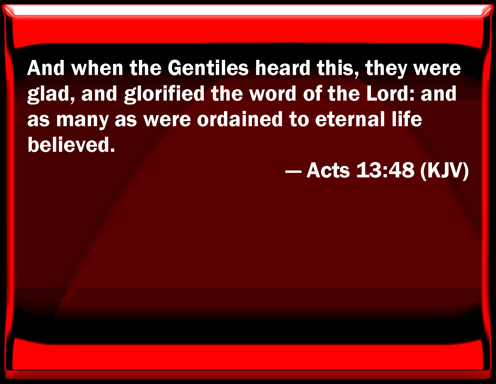 Bible Verse Slide Acts 13:48 And when the Gentiles heard this, they were glad, and glorified the word of the Lord: and as many as were ordained to eternal life believed. KJV: And when the Gentiles heard this, they were glad, and glorified the word of the Lord: and as many as were ordained to eternal life believed. DRB: And the Gentiles hearing it, were glad, and glorified the word of the Lord: and as many as were ordained to life everlasting, believed. DBT: And those of the nations, hearing it, rejoiced, and glorified the word of the Lord, and believed, as many as were ordained to eternal life. ERV: And as the Gentiles heard this, they were glad, and glorified the word of God: and as many as were ordained to eternal life believed. WBT: And when the Gentiles heard this, they were glad, and glorified the word of the Lord: and as many as were ordained to eternal life, believed. WEB: As the Gentiles heard this, they were glad, and glorified the word of God. As many as were appointed to eternal life believed. YLT: And the nations hearing were glad, and were glorifying the word of the Lord, and did believe — as many as were appointed to life age-during;Links Acts 13:48 NIV • Acts 13:48 NLT • Acts 13:48 ESV • Acts 13:48 NASB • Acts 13:48 KJV • Acts 13:48 Interlinear • Acts 13:48 Commentaries • Acts 13:48 Parallel Texts • Acts 13:48 Bible Apps • Acts 13:48 Parallel • Bible Hub |