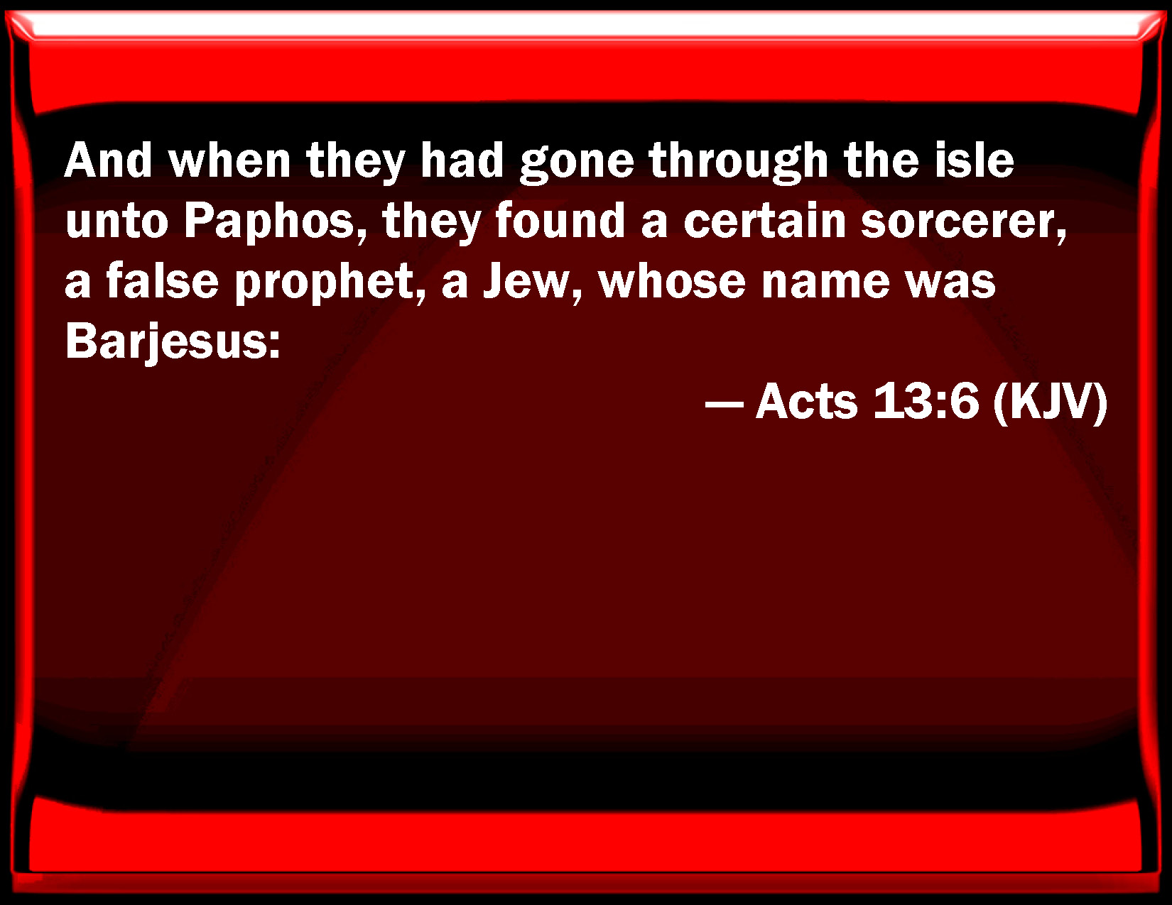 Bible Verse Slide Acts 13:6 And when they had gone through the isle to Paphos, they found a certain sorcerer, a false prophet, a Jew, whose name was Barjesus: KJV: And when they had gone through the isle unto Paphos, they found a certain sorcerer, a false prophet, a Jew, whose name was Barjesus: DRB: And when they had gone through the whole island, as far as Paphos, they found a certain man, a magician, a false prophet, a Jew, whose name was Bar-jesu: DBT: And having passed through the whole island as far as Paphos, they found a certain man a magician, a false prophet, a Jew, whose name was Bar-jesus, ERV: And when they had gone through the whole island unto Paphos, they found a certain sorcerer, a false prophet, a Jew, whose name was Bar-Jesus; WBT: And when they had gone through the isle to Paphos, they found a certain sorcerer, a false prophet, a Jew, whose name was Barjesus: WEB: When they had gone through the island to Paphos, they found a certain sorcerer, a false prophet, a Jew, whose name was Bar Jesus, YLT: and having gone through the island unto Paphos, they found a certain magian, a false prophet, a Jew, whose name is Bar-Jesus;Links Acts 13:6 NIV • Acts 13:6 NLT • Acts 13:6 ESV • Acts 13:6 NASB • Acts 13:6 KJV • Acts 13:6 Interlinear • Acts 13:6 Commentaries • Acts 13:6 Parallel Texts • Acts 13:6 Bible Apps • Acts 13:6 Parallel • Bible Hub |
