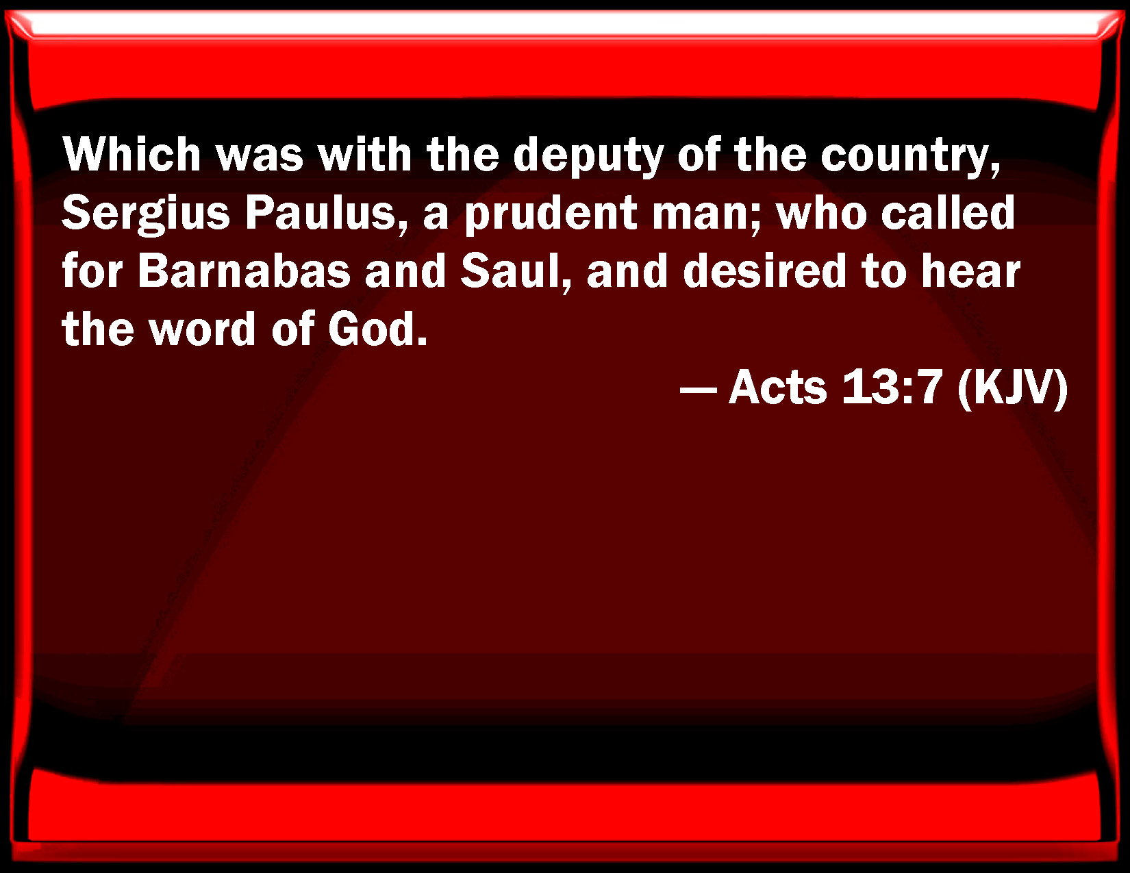 Bible Verse Slide Acts 13:7 Which was with the deputy of the country, Sergius Paulus, a prudent man; who called for Barnabas and Saul, and desired to hear the word of God. KJV: Which was with the deputy of the country, Sergius Paulus, a prudent man; who called for Barnabas and Saul, and desired to hear the word of God. DRB: Who was with the proconsul Sergius Paulus, a prudent man. He sending for Barnabas and Saul, desired to hear the word of God. DBT: who was with the proconsul Sergius Paulus, an intelligent man. He, having called Barnabas and Saul to him, desired to hear the word of God. ERV: which was with the proconsul, Sergius Paulus, a man of understanding. The same called unto him Barnabas and Saul, and sought to hear the word of God. WBT: Who was with the deputy of the country, Sergius Paulus, a prudent man; who called for Barnabas and Saul, and desired to hear the word of God. WEB: who was with the proconsul, Sergius Paulus, a man of understanding. This man summoned Barnabas and Saul, and sought to hear the word of God. YLT: who was with the proconsul Sergius Paulus, an intelligent man; this one having called for Barnabas and Saul, did desire to hear the word of God,Links Acts 13:7 NIV • Acts 13:7 NLT • Acts 13:7 ESV • Acts 13:7 NASB • Acts 13:7 KJV • Acts 13:7 Interlinear • Acts 13:7 Commentaries • Acts 13:7 Parallel Texts • Acts 13:7 Bible Apps • Acts 13:7 Parallel • Bible Hub |
