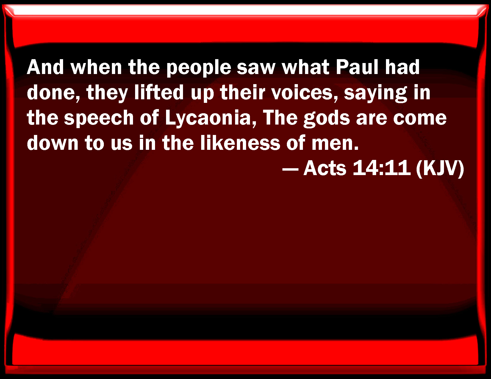 Bible Verse Slide Acts 14:11 And when the people saw what Paul had done, they lifted up their voices, saying in the speech of Lycaonia, The gods are come down to us in the likeness of men. KJV: And when the people saw what Paul had done, they lifted up their voices, saying in the speech of Lycaonia, The gods are come down to us in the likeness of men. DRB: And when the multitudes had seen what Paul had done, they lifted up their voice in the Lycaonian tongue, saying: The gods are come down to us in the likeness of men; DBT: But the crowds, who saw what Paul had done, lifted up their voices in Lycaonian, saying, The gods, having made themselves like men, are come down to us. ERV: And when the multitudes saw what Paul had done, they lifted up their voice, saying in the speech of Lycaonia, The gods are come down to us in the likeness of men. WBT: And when the people saw what Paul had done, they lifted up their voices, saying in the speech of Lycaonia, The gods have come down to us in the likeness of men. WEB: When the multitude saw what Paul had done, they lifted up their voice, saying in the language of Lycaonia, "The gods have come down to us in the likeness of men!" YLT: and the multitudes having seen what Paul did, did lift up their voice, in the speech of Lycaonia, saying, 'The gods, having become like men, did come down unto us;'Links Acts 14:11 NIV • Acts 14:11 NLT • Acts 14:11 ESV • Acts 14:11 NASB • Acts 14:11 KJV • Acts 14:11 Interlinear • Acts 14:11 Commentaries • Acts 14:11 Parallel Texts • Acts 14:11 Bible Apps • Acts 14:11 Parallel • Bible Hub |
