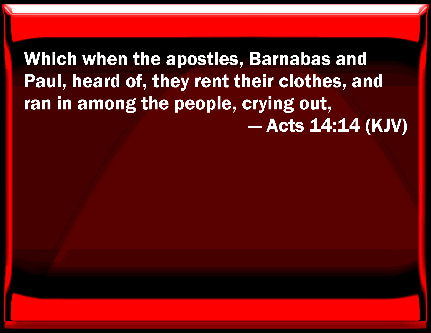 Bible Verse Slide Acts 14:14 Which when the apostles, Barnabas and Paul, heard of, they rent their clothes, and ran in among the people, crying out, KJV: Which when the apostles, Barnabas and Paul, heard of, they rent their clothes, and ran in among the people, crying out, DRB: Which, when the apostles Barnabas and Paul had heard, rending their clothes, they leaped out among the people, crying, DBT: But the apostles Barnabas and Paul, having heard it, rent their garments, and rushed out to the crowd, crying ERV: But when the apostles, Barnabas and Paul, heard of it, they rent their garments, and sprang forth among the multitude, crying out WBT: Which, when the apostles Barnabas and Paul heard of, they rent their clothes, and ran in among the people, crying out, WEB: But when the apostles, Barnabas and Paul, heard of it, they tore their clothes, and sprang into the multitude, crying out, YLT: and having heard, the apostles Barnabas and Paul, having rent their garments, did spring into the multitude, cryingLinks Acts 14:14 NIV • Acts 14:14 NLT • Acts 14:14 ESV • Acts 14:14 NASB • Acts 14:14 KJV • Acts 14:14 Interlinear • Acts 14:14 Commentaries • Acts 14:14 Parallel Texts • Acts 14:14 Bible Apps • Acts 14:14 Parallel • Bible Hub |
