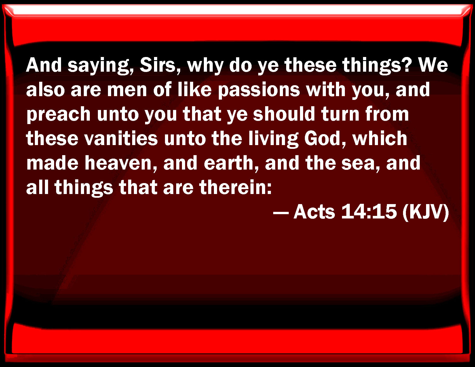 Bible Verse Slide Acts 14:15 And saying, Sirs, why do you these things? We also are men of like passions with you, and preach to you that you should turn from these vanities to the living God, which made heaven, and earth, and the sea, and all things that are therein: KJV: And saying, Sirs, why do ye these things? We also are men of like passions with you, and preach unto you that ye should turn from these vanities unto the living God, which made heaven, and earth, and the sea, and all things that are therein: DRB: And saying: Ye men, why do ye these things? We also are mortals, men like unto you, preaching to you to be converted from these vain things, to the living God, who made the heaven, and the earth, and the sea, and all things that are in them: DBT: and saying, Men, why do ye these things? We also are men of like passions with you, preaching to you to turn from these vanities to the living God, who made the heaven, and the earth, and the sea, and all things in them; ERV: and saying, Sirs, why do ye these things? We also are men of like passions with you, and bring you good tidings, that ye should turn from these vain things unto the living God, who made the heaven and the earth and the sea, and all that in them is: WBT: And saying, Sirs, why do ye these things? We also are men of like passions with you, and preach to you, that ye should turn from these vanities to the living God, who made heaven and earth, and the sea, and all things that are in them. WEB: "Men, why are you doing these things? We also are men of like passions with you, and bring you good news, that you should turn from these vain things to the living God, who made the sky and the earth and the sea, and all that is in them; YLT: and saying, 'Men, why these things do ye? and we are men like-affected with you, proclaiming good news to you, from these vanities to turn unto the living God, who made the heaven, and the earth, and the sea, and all the things in them;Links Acts 14:15 NIV • Acts 14:15 NLT • Acts 14:15 ESV • Acts 14:15 NASB • Acts 14:15 KJV • Acts 14:15 Interlinear • Acts 14:15 Commentaries • Acts 14:15 Parallel Texts • Acts 14:15 Bible Apps • Acts 14:15 Parallel • Bible Hub |