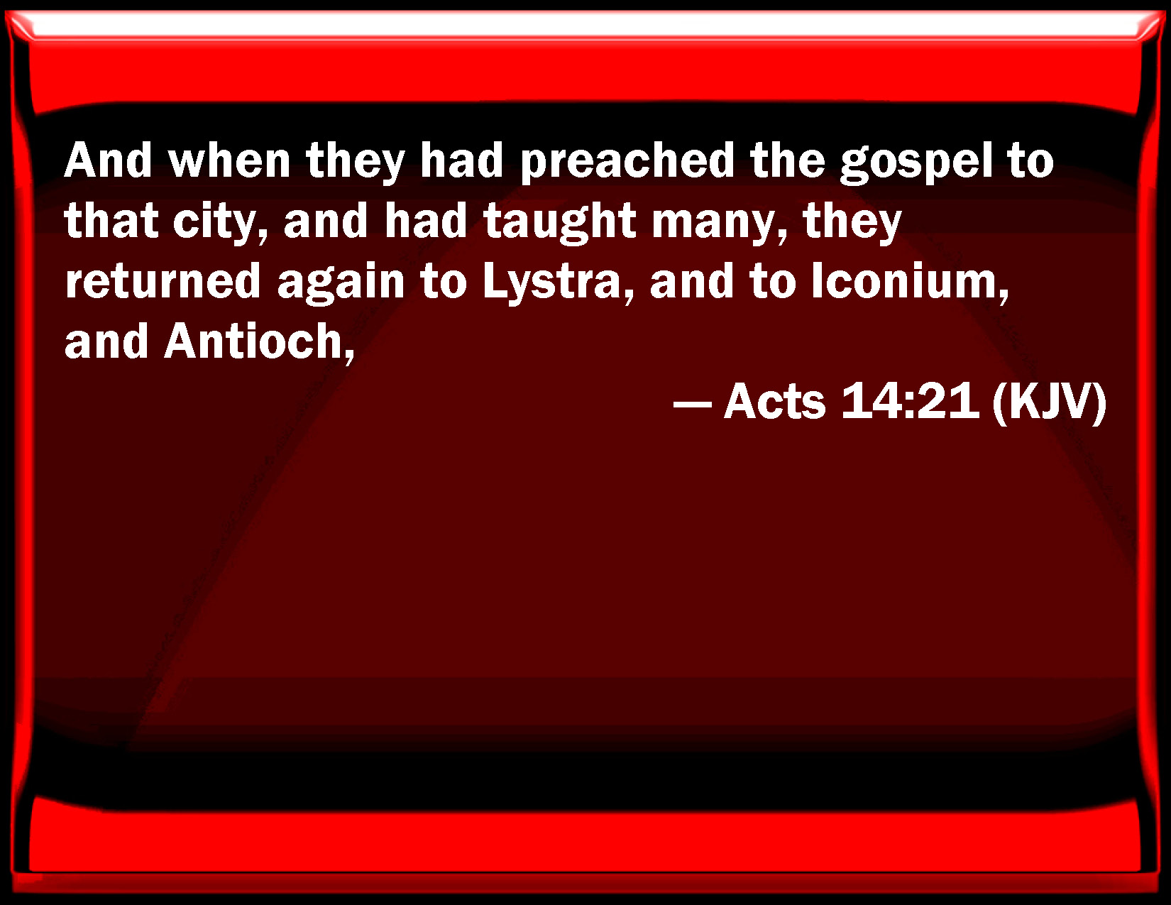 Bible Verse Slide Acts 14:21 And when they had preached the gospel to that city, and had taught many, they returned again to Lystra, and to Iconium, and Antioch, KJV: And when they had preached the gospel to that city, and had taught many, they returned again to Lystra, and to Iconium, and Antioch, DRB: And when they had preached the gospel to that city, and had taught many, they returned again to Lystra, and to Iconium, and to Antioch: DBT: And having announced the glad tidings to that city, and having made many disciples, they returned to Lystra, and Iconium, and Antioch, ERV: And when they had preached the gospel to that city, and had made many disciples, they returned to Lystra, and to Iconium, and to Antioch, WBT: And when they had preached the gospel to that city, and had taught many, they returned again to Lystra, and to Iconium, and to Antioch, WEB: When they had preached the Good News to that city, and had made many disciples, they returned to Lystra, Iconium, and Antioch, YLT: Having proclaimed good news also to that city, and having discipled many, they turned back to Lystra, and Iconium, and Antioch,Links Acts 14:21 NIV • Acts 14:21 NLT • Acts 14:21 ESV • Acts 14:21 NASB • Acts 14:21 KJV • Acts 14:21 Interlinear • Acts 14:21 Commentaries • Acts 14:21 Parallel Texts • Acts 14:21 Bible Apps • Acts 14:21 Parallel • Bible Hub |
