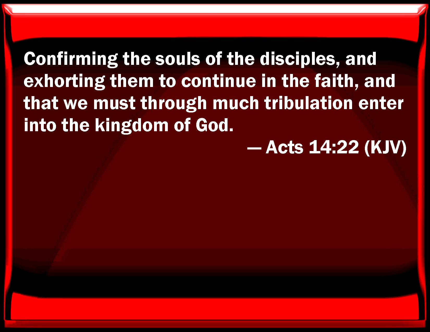 Bible Verse Slide Acts 14:22 Confirming the souls of the disciples, and exhorting them to continue in the faith, and that we must through much tribulation enter into the kingdom of God. KJV: Confirming the souls of the disciples, and exhorting them to continue in the faith, and that we must through much tribulation enter into the kingdom of God. DRB: Confirming the souls of the disciples, and exhorting them to continue in the faith: and that through many tribulations we must enter into the kingdom of God. DBT: establishing the souls of the disciples, exhorting them to abide in the faith, and that through many tribulations we must enter into the kingdom of God. ERV: confirming the souls of the disciples, exhorting them to continue in the faith, and that through many tribulations we must enter into the kingdom of God. WBT: Confirming the souls of the disciples, exhorting them to continue in the faith, and that we must through much tribulation enter into the kingdom of God. WEB: confirming the souls of the disciples, exhorting them to continue in the faith, and that through many afflictions we must enter into the Kingdom of God. YLT: confirming the souls of the disciples, exhorting to remain in the faith, and that through many tribulations it behoveth us to enter into the reign of God,Links Acts 14:22 NIV • Acts 14:22 NLT • Acts 14:22 ESV • Acts 14:22 NASB • Acts 14:22 KJV • Acts 14:22 Interlinear • Acts 14:22 Commentaries • Acts 14:22 Parallel Texts • Acts 14:22 Bible Apps • Acts 14:22 Parallel • Bible Hub |