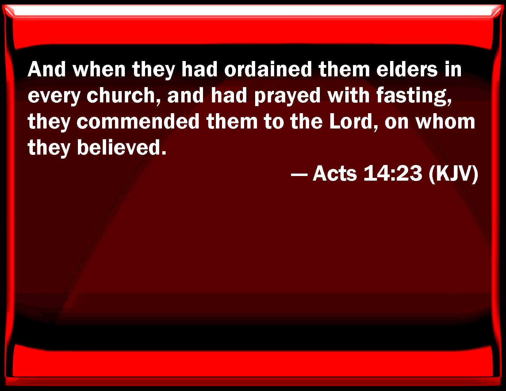 Bible Verse Slide Acts 14:23 And when they had ordained them elders in every church, and had prayed with fasting, they commended them to the Lord, on whom they believed. KJV: And when they had ordained them elders in every church, and had prayed with fasting, they commended them to the Lord, on whom they believed. DRB: And when they had ordained to them priests in every church, and had prayed with fasting, they commended them to the Lord, in whom they believed. DBT: And having chosen them elders in each assembly, having prayed with fastings, they committed them to the Lord, on whom they had believed. ERV: And when they had appointed for them elders in every church, and had prayed with fasting, they commended them to the Lord, on whom they had believed. WBT: And when they had ordained for them elders in every church, and had prayed with fasting, they commended them to the Lord, on whom they believed. WEB: When they had appointed elders for them in every assembly, and had prayed with fasting, they commended them to the Lord, on whom they had believed. YLT: and having appointed to them by vote elders in every assembly, having prayed with fastings, they commended them to the Lord in whom they had believed.Links Acts 14:23 NIV • Acts 14:23 NLT • Acts 14:23 ESV • Acts 14:23 NASB • Acts 14:23 KJV • Acts 14:23 Interlinear • Acts 14:23 Commentaries • Acts 14:23 Parallel Texts • Acts 14:23 Bible Apps • Acts 14:23 Parallel • Bible Hub |