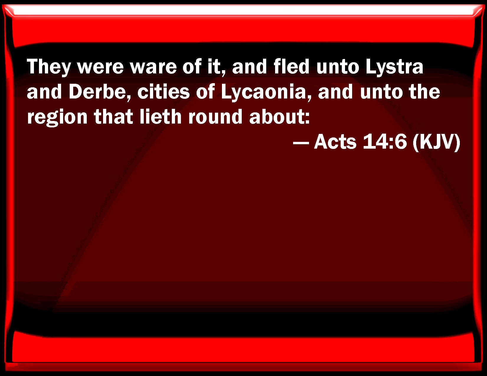 Bible Verse Slide Acts 14:6 They were ware of it, and fled to Lystra and Derbe, cities of Lycaonia, and to the region that lies round about: KJV: They were ware of it, and fled unto Lystra and Derbe, cities of Lycaonia, and unto the region that lieth round about: DRB: They understanding it, fled to Lystra, and Derbe, cities of Lycaonia, and to the whole country round about, DBT: they, being aware of it, fled to the cities of Lycaonia, Lystra and Derbe, and the surrounding country, ERV: they became aware of it, and fled unto the cities of Lycaonia, Lystra and Derbe, and the region round about: WBT: Being apprised of it, they fled to Lystra and Derbe, cities of Lycaonia, and to the region in that vicinity. WEB: they became aware of it, and fled to the cities of Lycaonia, Lystra, Derbe, and the surrounding region. YLT: they having become aware, did flee to the cities of Lycaonia, Lystra, and Derbe, and to the region round about,Links Acts 14:6 NIV • Acts 14:6 NLT • Acts 14:6 ESV • Acts 14:6 NASB • Acts 14:6 KJV • Acts 14:6 Interlinear • Acts 14:6 Commentaries • Acts 14:6 Parallel Texts • Acts 14:6 Bible Apps • Acts 14:6 Parallel • Bible Hub |