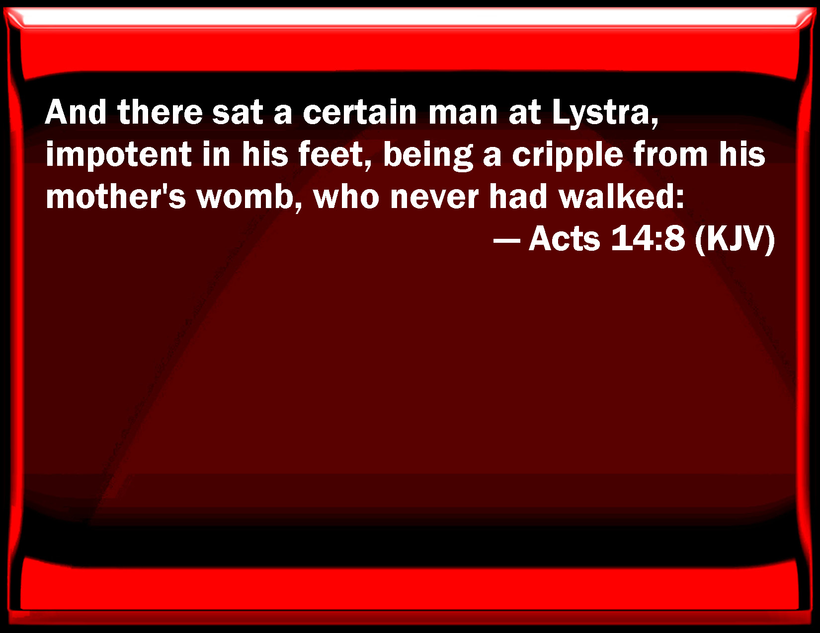 Bible Verse Slide Acts 14:8 And there sat a certain man at Lystra, weak in his feet, being a cripple from his mother's womb, who never had walked: KJV: And there sat a certain man at Lystra, impotent in his feet, being a cripple from his mother's womb, who never had walked: DRB: And there sat a certain man at Lystra, impotent in his feet, a cripple from his mother's womb, who never had walked. DBT: And a certain man in Lystra, impotent in his feet, sat, being lame from his mother's womb, who had never walked. ERV: And at Lystra there sat a certain man, impotent in his feet, a cripple from his mother's womb, who never had walked. WBT: And there sat a certain man at Lystra, impotent in his feet, being a cripple from his mother's womb, who had never walked. WEB: At Lystra a certain man sat, impotent in his feet, a cripple from his mother's womb, who never had walked. YLT: And a certain man in Lystra, impotent in the feet, was sitting, being lame from the womb of his mother — who never had walked,Links Acts 14:8 NIV • Acts 14:8 NLT • Acts 14:8 ESV • Acts 14:8 NASB • Acts 14:8 KJV • Acts 14:8 Interlinear • Acts 14:8 Commentaries • Acts 14:8 Parallel Texts • Acts 14:8 Bible Apps • Acts 14:8 Parallel • Bible Hub |
