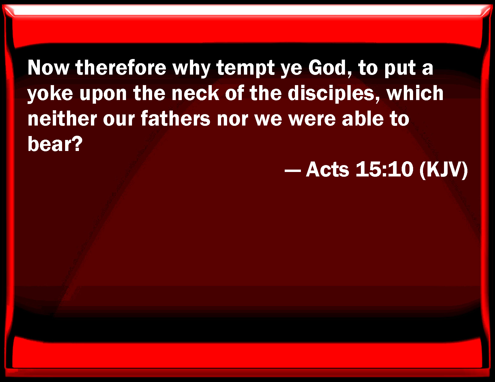 Bible Verse Slide Acts 15:10 Now therefore why tempt you God, to put a yoke on the neck of the disciples, which neither our fathers nor we were able to bear? KJV: Now therefore why tempt ye God, to put a yoke upon the neck of the disciples, which neither our fathers nor we were able to bear? DRB: Now therefore, why tempt you God to put a yoke upon the necks of the disciples, which neither our fathers nor we have been able to bear? DBT: Now therefore why tempt ye God, by putting a yoke upon the neck of the disciples, which neither our fathers nor we have been able to bear? ERV: Now therefore why tempt ye God, that ye should put a yoke upon the neck of the disciples, which neither our fathers nor we were able to bear? WBT: Now therefore why tempt ye God, to put a yoke upon the neck of the disciples, which neither our fathers nor we were able to bear? WEB: Now therefore why do you tempt God, that you should put a yoke on the neck of the disciples which neither our fathers nor we were able to bear? YLT: now, therefore, why do ye tempt God, to put a yoke upon the neck of the disciples, which neither our fathers nor we were able to bear?Links Acts 15:10 NIV • Acts 15:10 NLT • Acts 15:10 ESV • Acts 15:10 NASB • Acts 15:10 KJV • Acts 15:10 Interlinear • Acts 15:10 Commentaries • Acts 15:10 Parallel Texts • Acts 15:10 Bible Apps • Acts 15:10 Parallel • Bible Hub |