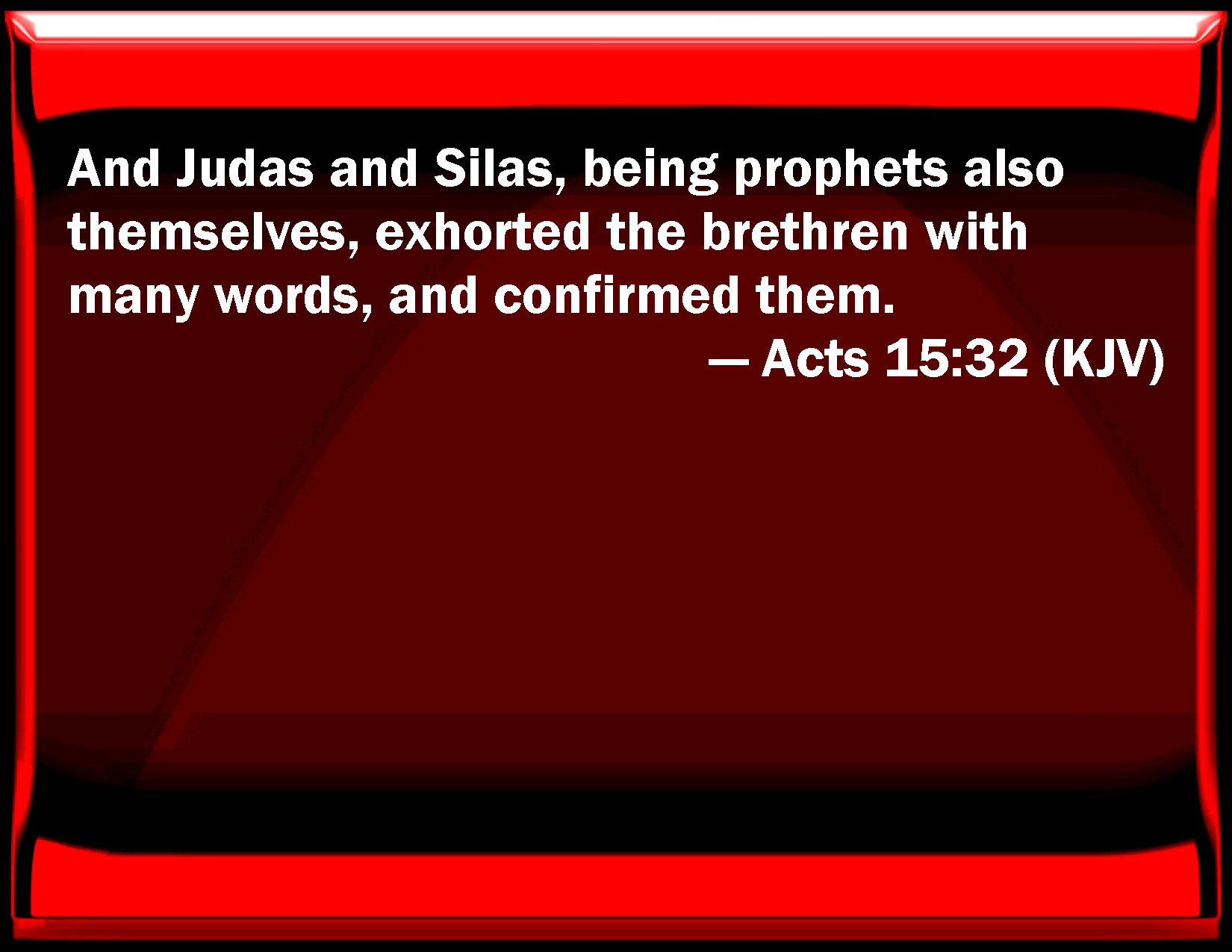 Bible Verse Slide Acts 15:32 And Judas and Silas, being prophets also themselves, exhorted the brothers with many words, and confirmed them. KJV: And Judas and Silas, being prophets also themselves, exhorted the brethren with many words, and confirmed them. DRB: But Judas and Silas, being prophets also themselves, with many words comforted the brethren, and confirmed them. DBT: And Judas and Silas, being themselves also prophets, exhorted the brethren with much discourse, and strengthened them. ERV: And Judas and Silas, being themselves also prophets, exhorted the brethren with many words, and confirmed them. WBT: And Judas and Silas, being prophets also themselves, exhorted the brethren with many words, and confirmed them. WEB: Judas and Silas, also being prophets themselves, encouraged the brothers with many words, and strengthened them. YLT: Judas also and Silas, being themselves also prophets, through much discourse did exhort the brethren, and confirm,Links Acts 15:32 NIV • Acts 15:32 NLT • Acts 15:32 ESV • Acts 15:32 NASB • Acts 15:32 KJV • Acts 15:32 Interlinear • Acts 15:32 Commentaries • Acts 15:32 Parallel Texts • Acts 15:32 Bible Apps • Acts 15:32 Parallel • Bible Hub |