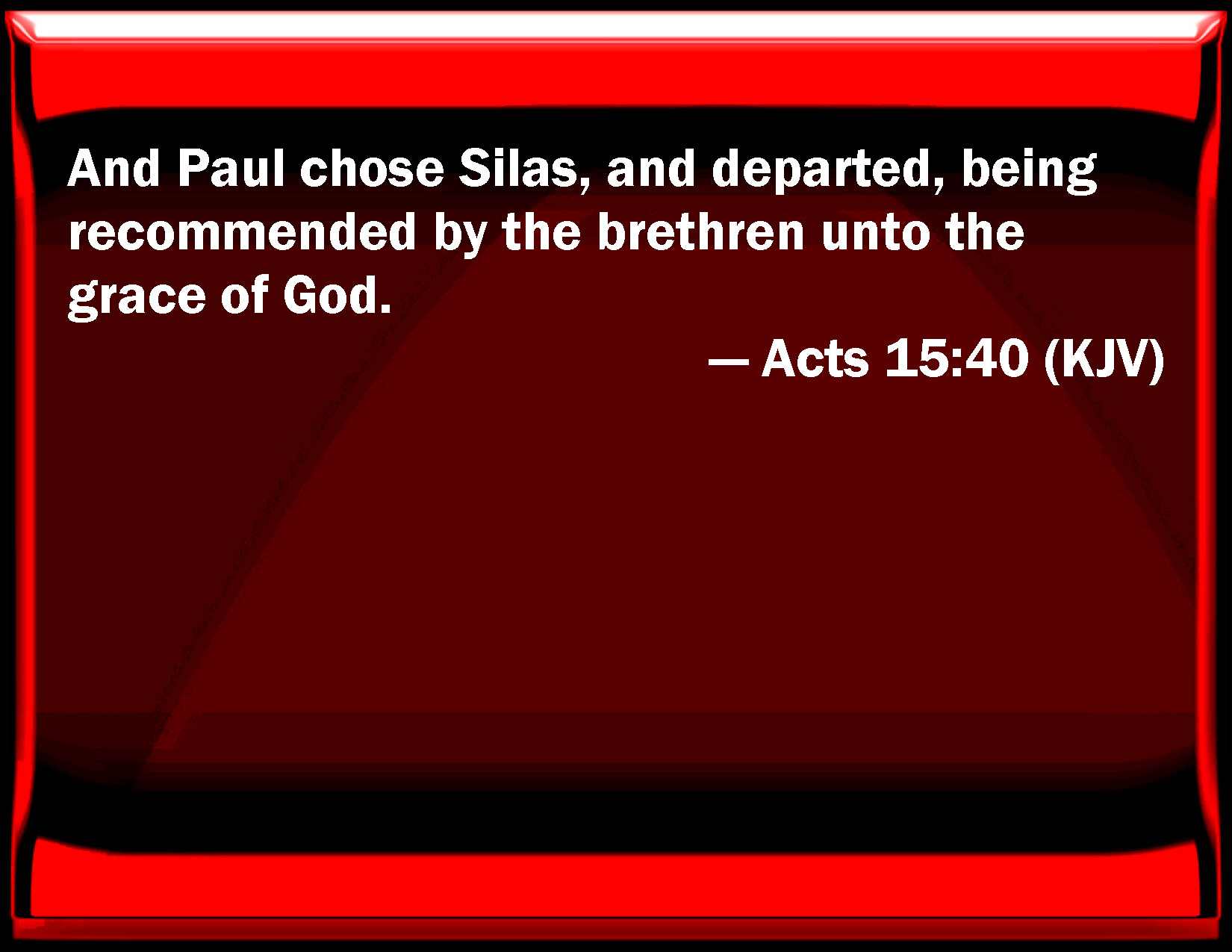 Bible Verse Slide Acts 15:40 And Paul chose Silas, and departed, being recommended by the brothers to the grace of God. KJV: And Paul chose Silas, and departed, being recommended by the brethren unto the grace of God. DRB: But Paul choosing Silas, departed, being delivered by the brethren to the grace of God. DBT: but Paul having chosen Silas went forth, committed by the brethren to the grace of God. ERV: but Paul chose Silas, and went forth, being commended by the brethren to the grace of the Lord. WBT: And Paul chose Silas, and departed, being commended by the brethren to the grace of God. WEB: but Paul chose Silas, and went out, being commended by the brothers to the grace of God. YLT: and Paul having chosen Silas, went forth, having been given up to the grace of God by the brethren;Links Acts 15:40 NIV • Acts 15:40 NLT • Acts 15:40 ESV • Acts 15:40 NASB • Acts 15:40 KJV • Acts 15:40 Interlinear • Acts 15:40 Commentaries • Acts 15:40 Parallel Texts • Acts 15:40 Bible Apps • Acts 15:40 Parallel • Bible Hub |