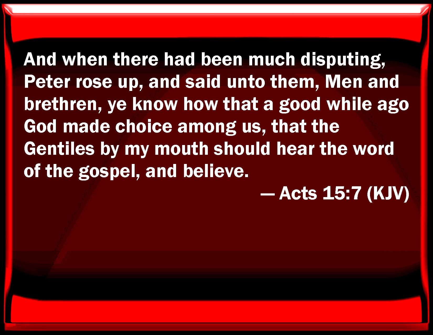 Bible Verse Slide Acts 15:7 And when there had been much disputing, Peter rose up, and said to them, Men and brothers, you know how that a good while ago God made choice among us, that the Gentiles by my mouth should hear the word of the gospel, and believe. KJV: And when there had been much disputing, Peter rose up, and said unto them, Men and brethren, ye know how that a good while ago God made choice among us, that the Gentiles by my mouth should hear the word of the gospel, and believe. DRB: And when there had been much disputing, Peter, rising up, said to them: Men, brethren, you know, that in former days God made choice among us, that by my mouth the Gentiles should hear the word of the gospel, and believe. DBT: And much discussion having taken place, Peter, standing up, said to them, Brethren, ye know that from the earliest days God amongst you chose that the nations by my mouth should hear the word of the glad tidings and believe. ERV: And when there had been much questioning, Peter rose up, and said unto them, Brethren, ye know how that a good while ago God made choice among you, that by my mouth the Gentiles should hear the word of the gospel, and believe. WBT: And when there had been much disputing, Peter rose and said to them, Men, brethren, ye know that a good while ago, God made choice among us, that the Gentiles, by my mouth should hear the word of the gospel, and believe. WEB: When there had been much discussion, Peter rose up and said to them, "Brothers, you know that a good while ago God made a choice among you, that by my mouth the nations should hear the word of the Good News, and believe. YLT: and there having been much disputing, Peter having risen up said unto them, 'Men, brethren, ye know that from former days, God among us did make choice, through my mouth, for the nations to hear the word of the good news, and to believe;Links Acts 15:7 NIV • Acts 15:7 NLT • Acts 15:7 ESV • Acts 15:7 NASB • Acts 15:7 KJV • Acts 15:7 Interlinear • Acts 15:7 Commentaries • Acts 15:7 Parallel Texts • Acts 15:7 Bible Apps • Acts 15:7 Parallel • Bible Hub |