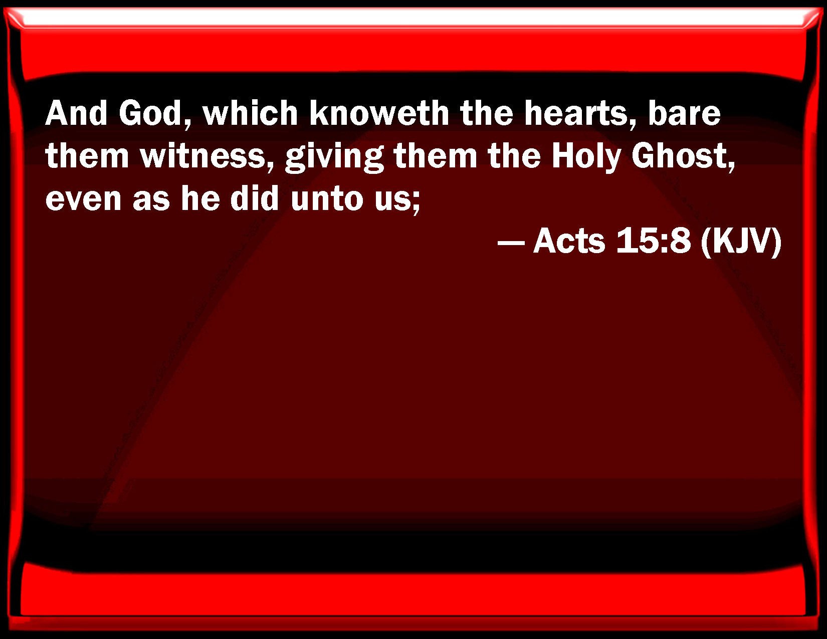 Bible Verse Slide Acts 15:8 And God, which knows the hearts, bore them witness, giving them the Holy Ghost, even as he did to us; KJV: And God, which knoweth the hearts, bare them witness, giving them the Holy Ghost, even as he did unto us; DRB: And God, who knoweth the hearts, gave testimony, giving unto them the Holy Ghost, as well as to us; DBT: And the heart-knowing God bore them witness, giving them the Holy Spirit as to us also, ERV: And God, which knoweth the heart, bare them witness, giving them the Holy Ghost, even as he did unto us; WBT: And God, who knoweth the hearts, bore them witness, giving to them the Holy Spirit, even as he did to us: WEB: God, who knows the heart, testified about them, giving them the Holy Spirit, just like he did to us. YLT: and the heart-knowing God did bare them testimony, having given to them the Holy Spirit, even as also to us,Links Acts 15:8 NIV • Acts 15:8 NLT • Acts 15:8 ESV • Acts 15:8 NASB • Acts 15:8 KJV • Acts 15:8 Interlinear • Acts 15:8 Commentaries • Acts 15:8 Parallel Texts • Acts 15:8 Bible Apps • Acts 15:8 Parallel • Bible Hub |