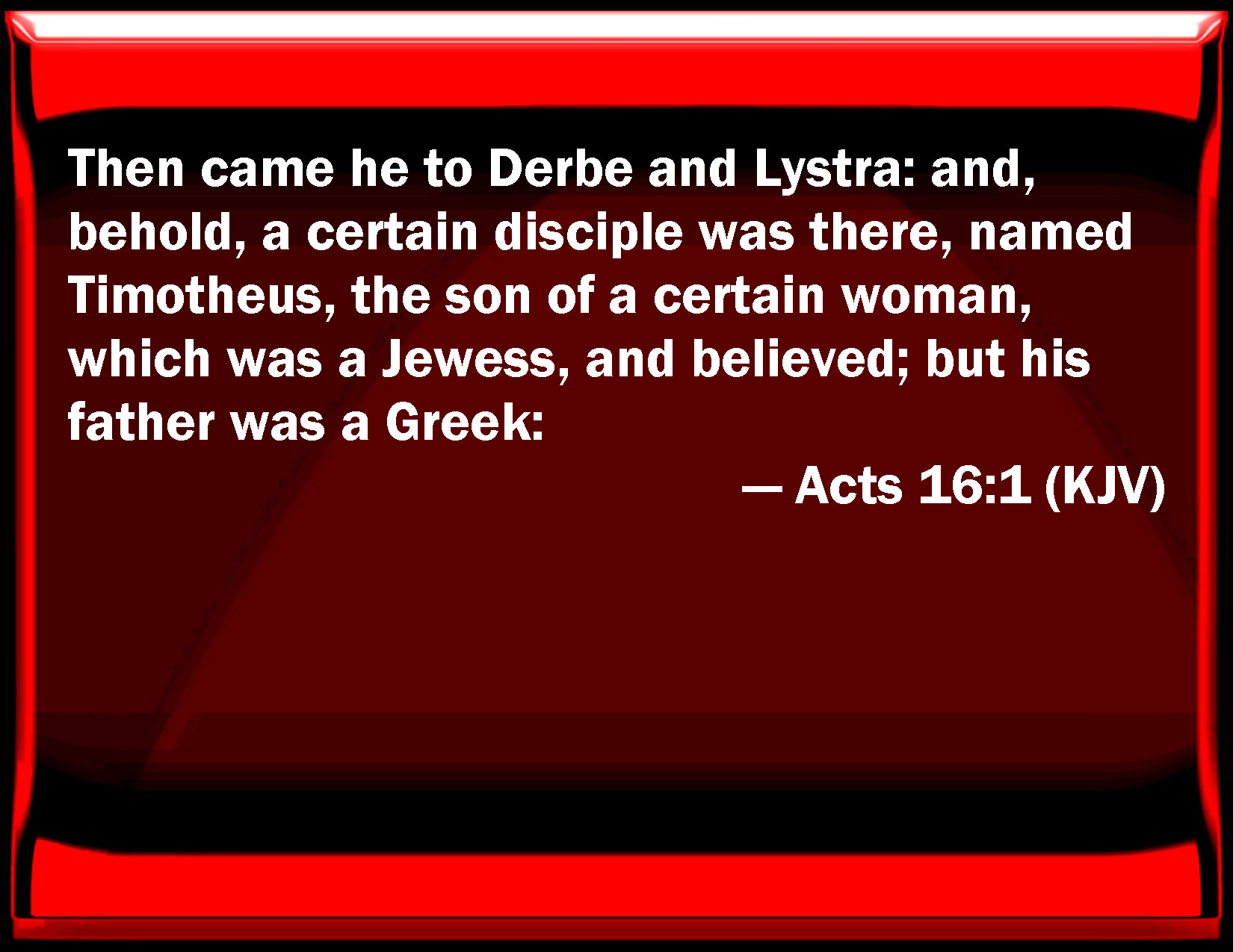 Bible Verse Slide Acts 16:1 Then came he to Derbe and Lystra: and, behold, a certain disciple was there, named Timotheus, the son of a certain woman, which was a Jewess, and believed; but his father was a Greek: KJV: Then came he to Derbe and Lystra: and, behold, a certain disciple was there, named Timotheus, the son of a certain woman, which was a Jewess, and believed; but his father was a Greek: DRB: AND he came to Derbe and Lystra. And behold, there was a certain disciple there named Timothy, the son of a Jewish woman that believed; but his father was a Gentile. DBT: And he came to Derbe and Lystra: and behold, a certain disciple was there, by name Timotheus, son of a Jewish believing woman, but the father a Greek, ERV: And he came also to Derbe and to Lystra: and behold, a certain disciple was there, named Timothy, the son of a Jewess which believed; but his father was a Greek. WBT: Then he came to Derbe and Lystra: and behold, a certain disciple was there, named Timothy, the son of a certain woman who was a Jewess, and believed, but his father was a Greek. WEB: He came to Derbe and Lystra: and behold, a certain disciple was there, named Timothy, the son of a Jewess who believed; but his father was a Greek. YLT: And he came to Derbe and Lystra, and lo, a certain disciple was there, by name Timotheus son of a certain woman, a believing Jewess, but of a father, a Greek,Links Acts 16:1 NIV • Acts 16:1 NLT • Acts 16:1 ESV • Acts 16:1 NASB • Acts 16:1 KJV • Acts 16:1 Interlinear • Acts 16:1 Commentaries • Acts 16:1 Parallel Texts • Acts 16:1 Bible Apps • Acts 16:1 Parallel • Bible Hub |
